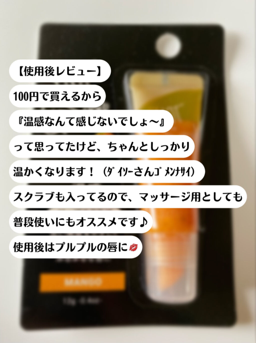 YouTubeで見て気になったので購入しましたー!!DAISOの&.Wチャームリップスクラブ私が買ったのはクリアタイプですが、オレンジ?みたいなのも売ってました!!ノック式のリップスクラブで、最初こそ硬めのテクスチャーかと思いましたが、塗布す...
