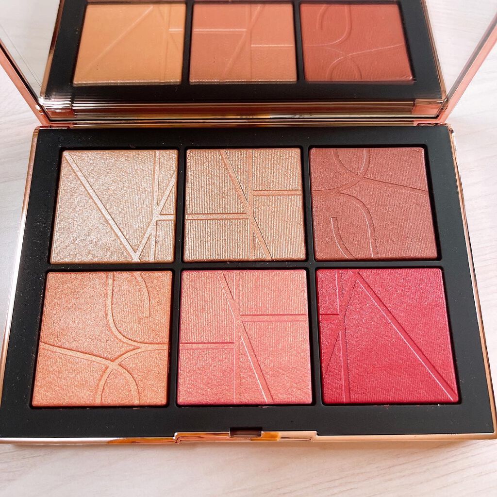 アイコニックなピーチピンクシェードのOrgasmにインスパイアされ太陽にキスされたかのような健康的なコーラルや、ゴールドトーンの計6シェードを詰め込んだ限定のチークパレット。 アイシャドウにも使えるタイプです。 アイシャドウは色持ちよく汗かいても落ちず、チークもマスクに付きにくく落ちにくかったです。 ツヤツヤしすぎず程よいツヤ感で品のあるメイクができます。 パッケージはミラーのようになっていて指紋は付きやすいですがかなり可愛いです! 可愛すぎるカラーが入っていて、6色で18gという超大容量でコスパはかなりいいです!