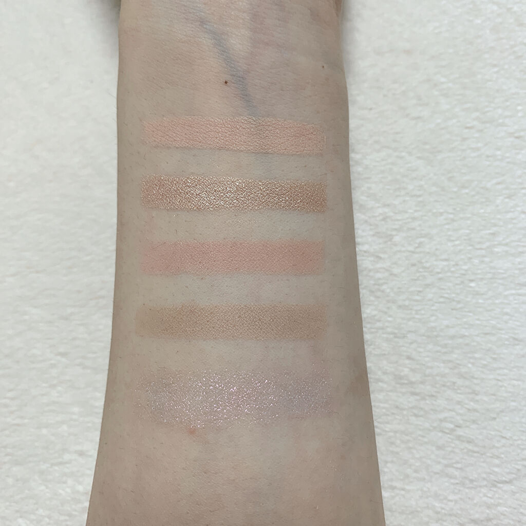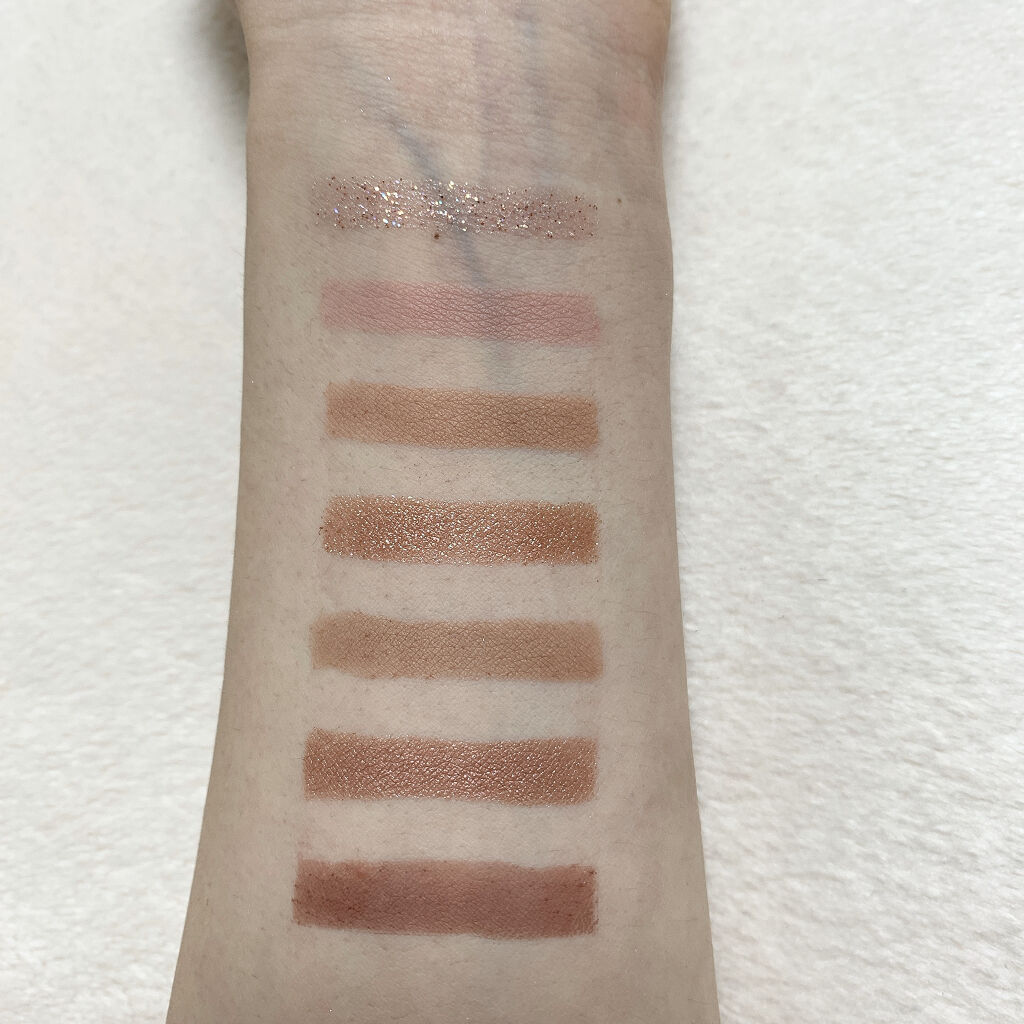 めっちゃくちゃ進化してるーーー😳😳😳 ブラシでも指でも取った瞬間の柔らかさが桁違いに良くなってる!!! ふわっとブレンドしやすくてボカしやすい!!! 05トフィーナッツラテはデイリー使いしやすい ナチュラル発色でかなり自然な仕上がり🥜 今っぽい色味で盛らずに陰影で盛る感じです💗 明度にしっかり差があって陰影をつけやすい◎ 06バニラティーラテはほろ苦ピンクメイクに🎀 05と比較するとかなり強い発色で スモーキーメイクに合いそうなパレット! パレット左から2番目のホワイトラメが ほんとに可愛くて透けるように光る感じ💎