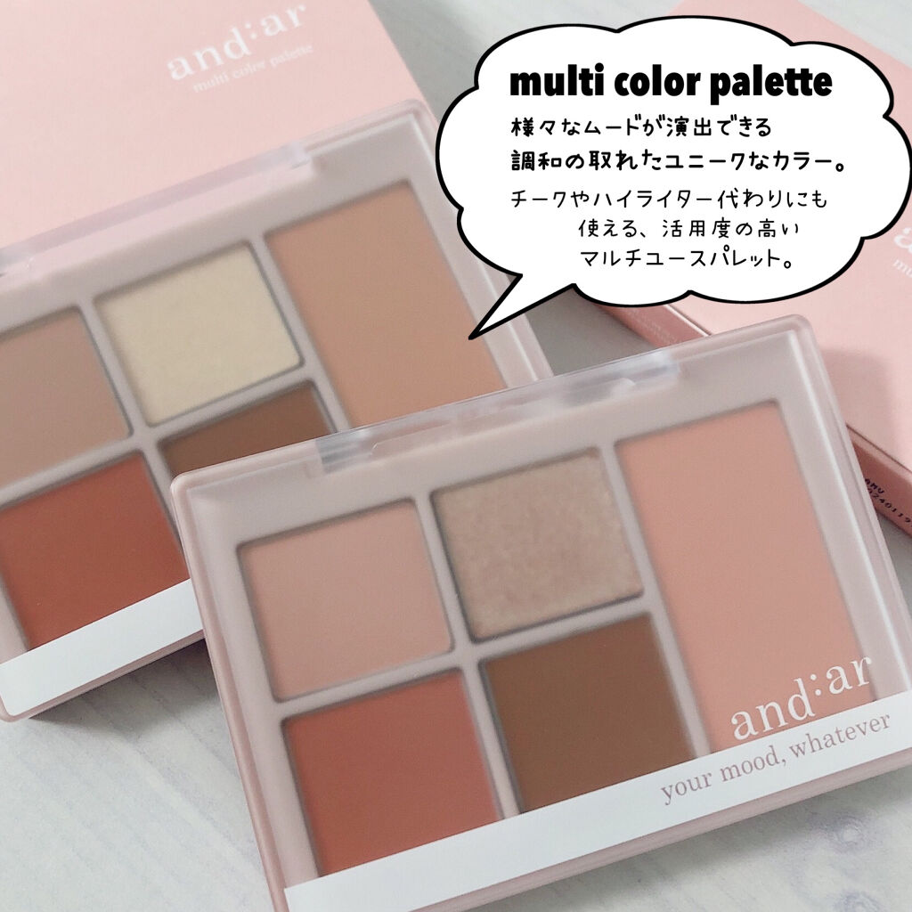 - 豊富な色味のポイントカラー、上品なカラー感、そして柔らかいチークカラーまで、ひとつに詰め込んでさまざまな雰囲気を完成できるアンディアルマルチカラーパレット。