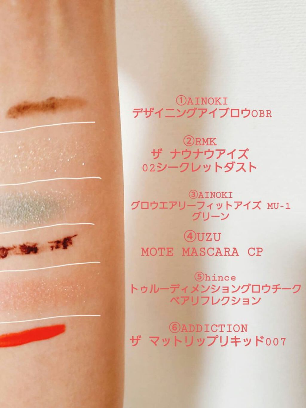 アイブロウは#whomeeのレッドブラウンを使用。 アイメイクは①#アンドビーの#クリームアイシャドウ マスタードを上下の瞼に。 アイメイクは②#misshaの#グリッタープリズムシャドウマーブル #ストームプリズムを①に重ねて。 下瞼は全体ではなく、黒目下にだけ✨ アイメイクは③#hinceの#ニューアンビエンスカラーアイライナー #エクレクティックを4枚目のように三角形に入れる。 チークは⑤#bisouの#ダイヤモンドグロウ マーズをほんのり✨ リップは⑥①のマスタードを塗った後に#celvokeの#エンスロールマットリップス 03を💋