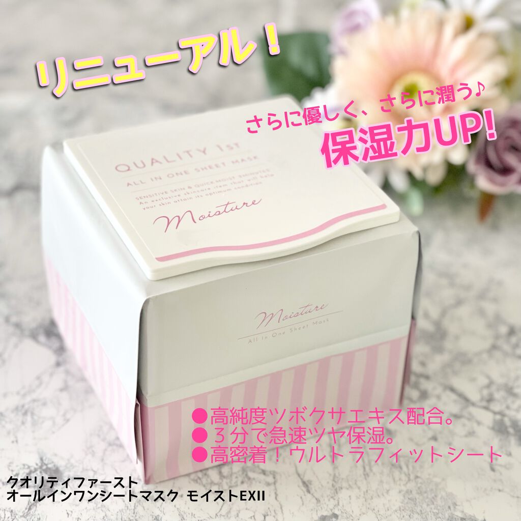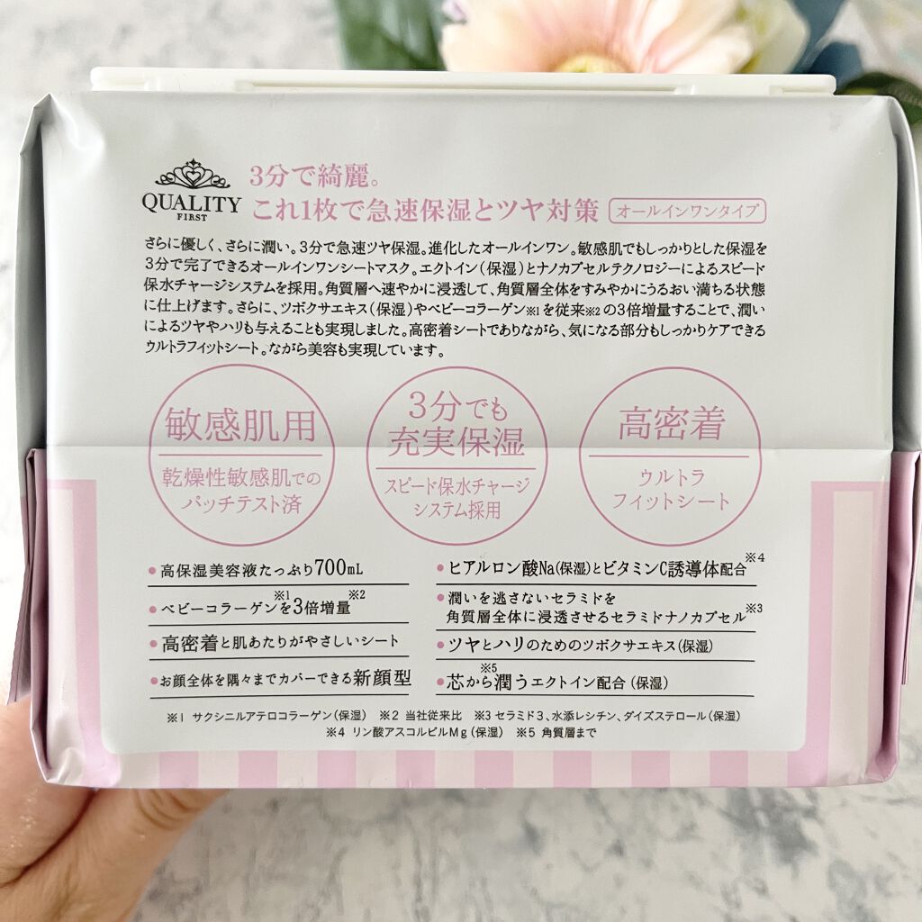 クオリティファーストオールインワンシートマスクモイスト化粧水・乳液・美容液の3つの役割を1枚で果たすオールインワンシートマスク♪洗顔後のスキンケアをこれだけで完了でき、毎日の使用に適したコスパの良さも魅力◎忙しい朝晩でも気軽に取り入れられます...