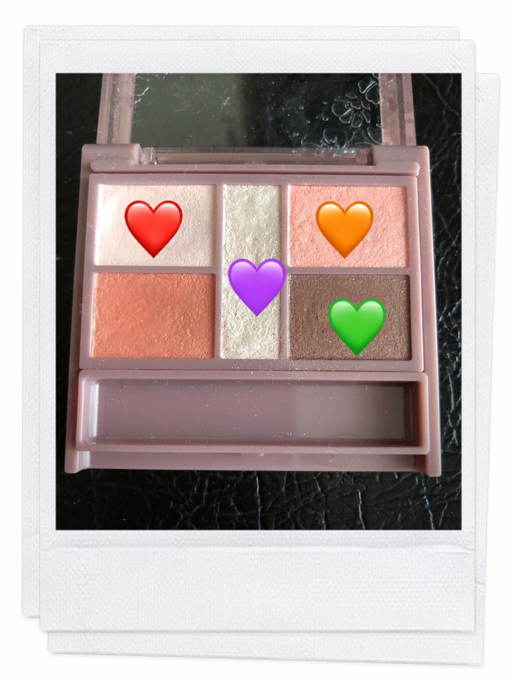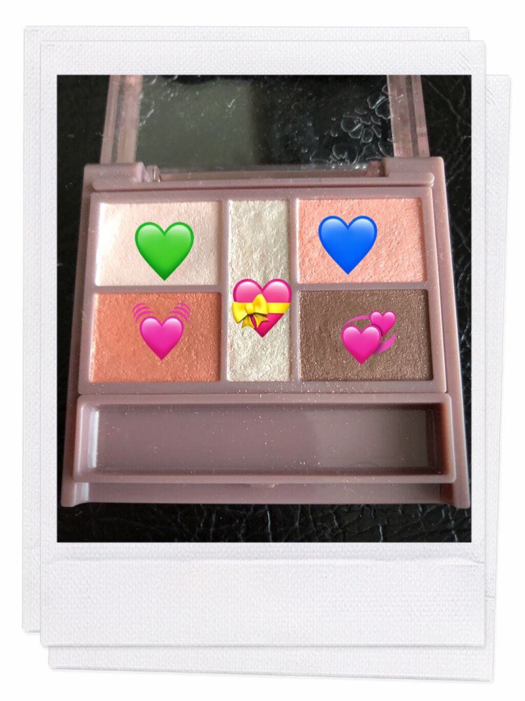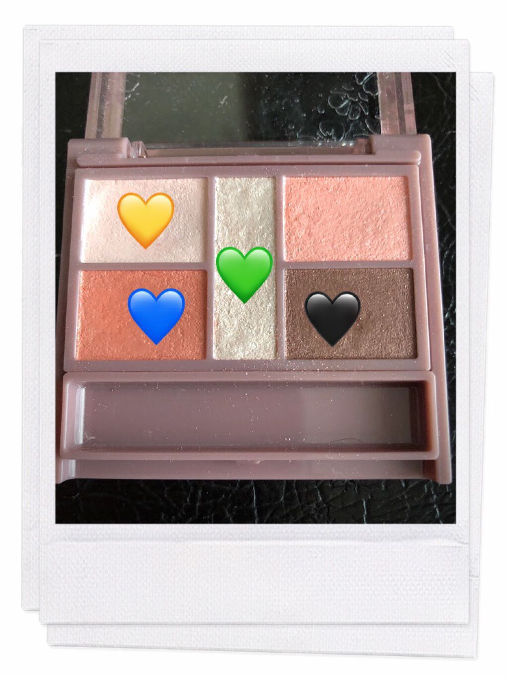 - 1枚のパレットで2つのスタイルが完成! 5色の欲ばりアイシャドウ♥ メインカラーを選んで2つのスタイルが楽しめる! A→B→D でスタイル1 A→C→D でスタイル2 繊細な粉質が、しっとりとまぶたに密着して色落ちを防ぎます。 透明感のあるキラうるトッピングジュエル(繊細ラメ)は、気分によってトッピング!