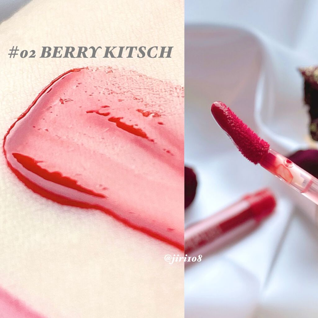 - <01 #Cheeky Peach> 水、ジフェニルジメチコン、ビスジグリセリルポリアシルアジペート-2、リンゴ酸ジイソステアリル、オクチルドデカノール、水添ポリイソブテン、グリセリン、ダイマージリノール酸ダイマージリノレイルビス(ベヘニル/イソステアリル/フィトステリル)、セチルPEG/PPG-10/1ジメチコン、DPG、イソステアリン酸ソルビタン、ポリソルベート60、ペンチレングリコール、ホホバ種子油、フェノキシエタノール、ヒアルロン酸Na、酸化チタン、ハチミツエキス、BG、スクワラン、(アクリル酸ヒドロキシエチル/アクリロイルジメチルタウリンNa)コポリマー、エチルヘキシルグリセリン、黄5、青1、黄4、赤104(1)、セテアレス-20、赤227、香料 <02 #Berry Kitsch> 水、ジフェニルジメチコン、ビスジグリセリルポリアシルアジペート-2、リンゴ酸ジイソステアリル、オクチルドデカノール、水添ポリイソブテン、ダイマージリノール酸ダイマージリノレイルビス(ベヘニル/イソステアリル/フィトステリル)、グリセリン、セチルPEG/PPG-10/1ジメチコン、DPG、イソステアリン酸ソルビタン、ポリソルベート60、ペンチレングリコール、ホホバ種子油、フェノキシエタノール、ヒアルロン酸Na、ハチミツエキス、BG、スクワラン、(アクリル酸ヒドロキシエチル/アクリロイルジメチルタウリンNa)コポリマー、エチルヘキシルグリセリン、黄5、青1、赤104(1)、セテアレス-20、赤227、香料 <03 #Kill Me Plum> 水、ジフェニルジメチコン、ビスジグリセリルポリアシルアジペート-2、リンゴ酸ジイソステアリル、オクチルドデカノール、水添ポリイソブテン、ダイマージリノール酸ダイマージリノレイルビス(ベヘニル/イソステアリル/フィトステリル)、グリセリン、セチルPEG/PPG-10/1ジメチコン、DPG、イソステアリン酸ソルビタン、ポリソルベート60、ペンチレングリコール、ホホバ種子油、フェノキシエタノール、ヒアルロン酸Na、ハチミツエキス、BG、スクワラン、(アクリル酸ヒドロキシエチル/アクリロイルジメチルタウリンNa)コポリマー、エチルヘキシルグリセリン、黄5、青1、黄4、セテアレス-20、赤227、香料 <04 #Lively Nude> 水、ジフェニルジメチコン、ビスジグリセリルポリアシルアジペート-2、リンゴ酸ジイソステアリル、オクチルドデカノール、水添ポリイソブテン、ダイマージリノール酸ダイマージリノレイルビス(ベヘニル/イソステアリル/フィトステリル)、グリセリン、セチルPEG/PPG-10/1ジメチコン、DPG、イソステアリン酸ソルビタン、ポリソルベート60、ペンチレングリコール、ホホバ種子油、フェノキシエタノール、ヒアルロン酸Na、酸化チタン、ハチミツエキス、BG、スクワラン、(アクリル酸ヒドロキシエチル/アクリロイルジメチルタウリンNa)コポリマー、エチルヘキシルグリセリン、黄5、青1、黄4、赤104(1)、セテアレス-20、赤227、香料