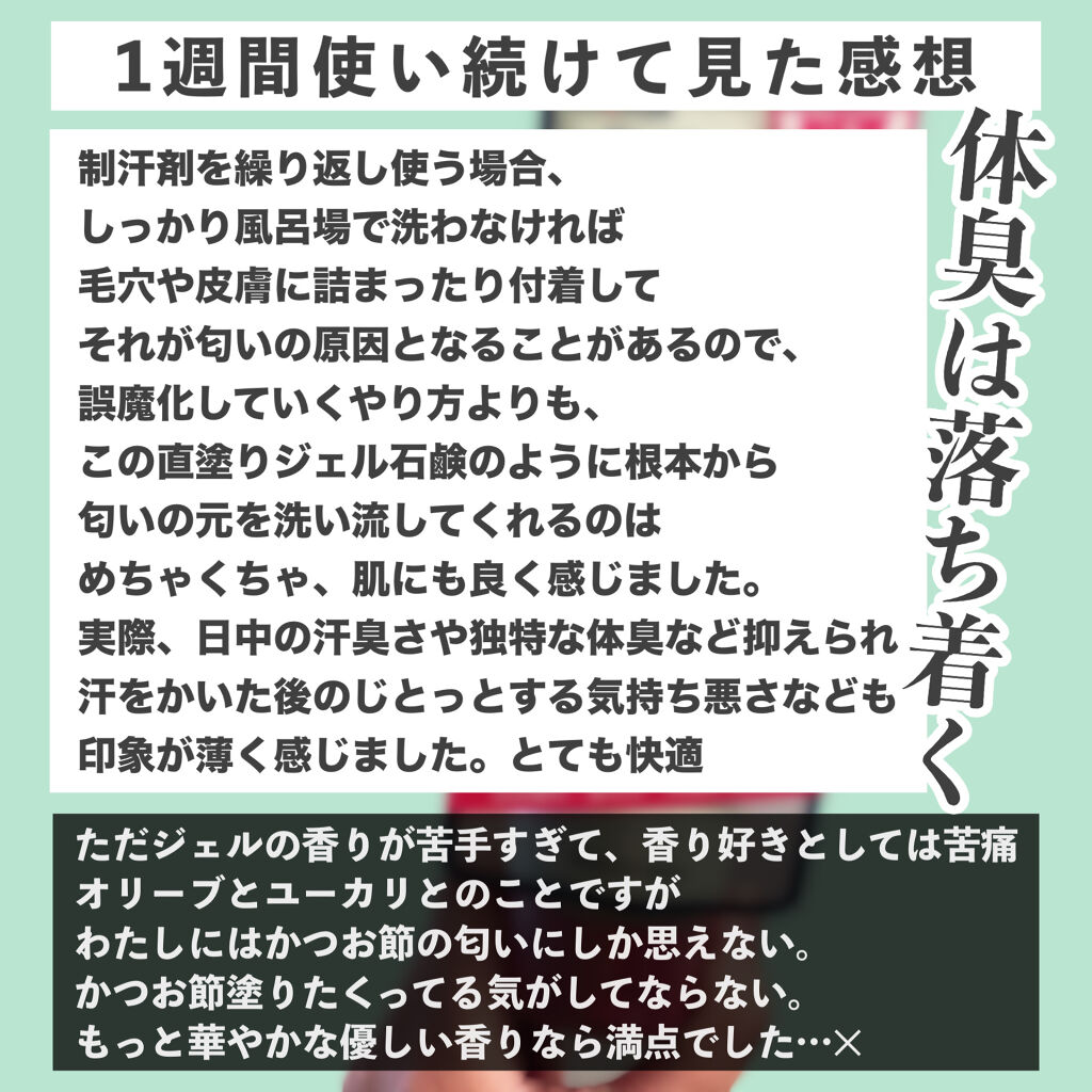 - \11年間ず~っと売上No.1*直ヌリ制汗デオドラントブランド/ 泡立てずに!オリーブのジェルの力で皮脂・ニオイまで**洗い落とす全身洗浄料「直ヌリジェル石けん」 ◆◆商品特長◆◆ 1.ニオイの原因となる酸化した皮脂汚れをすっきりと落としながら、うるおいは保つ 2.肌がキュキュッとする、新感覚のすっきりとした洗いあがり 3.主原料は天然オリーブオイル***で合成香料、着色料、防腐剤、無添加 オリーブとユーカリ由来の天然の色と香り 4.ミョウバン配合**** ◆◆こんな方へおすすめ◆◆ ・日ごろから制汗デオドラントを使っている人 ・いつも使っているボディソープでは汗やニオイがすっきり落とせていない気がする人 ・とにかく汗・ニオイをしっかり落としたいと思っている人 ==注意== ●お肌に合わないとき、傷、はれもの、湿疹等、異常のあるときは使用しない。●使用中、赤み、はれ、かゆみ、刺激等の異常があらわれたときは使用を中止し、皮フ科専門医等に相談する。そのまま使用を続けると症状が悪化する場合がある。●目に入らないよう注意し、万一目に入った場合は、すぐに洗い流す。異常が残る場合は眼科医に相談する。●使用後はキャップをしっかり閉め、直射日光のあたる場所、極端に高温、低温、または多湿の場所を避けて保管する。●乳幼児の手の届くところに置かない。 販売名:DNジェルソープa *インテージSRI+制汗剤市場 2013年5月~2024年4月 ソフトストーンW(販売名:デオナチュレソフトストーンEX(リニューアル前処方)・DN薬用スティックFe)累計販売金額 **ニオイの元となる皮脂を洗浄することによる ***基剤:オリーブ果実油 ****アルムK(収れん剤)