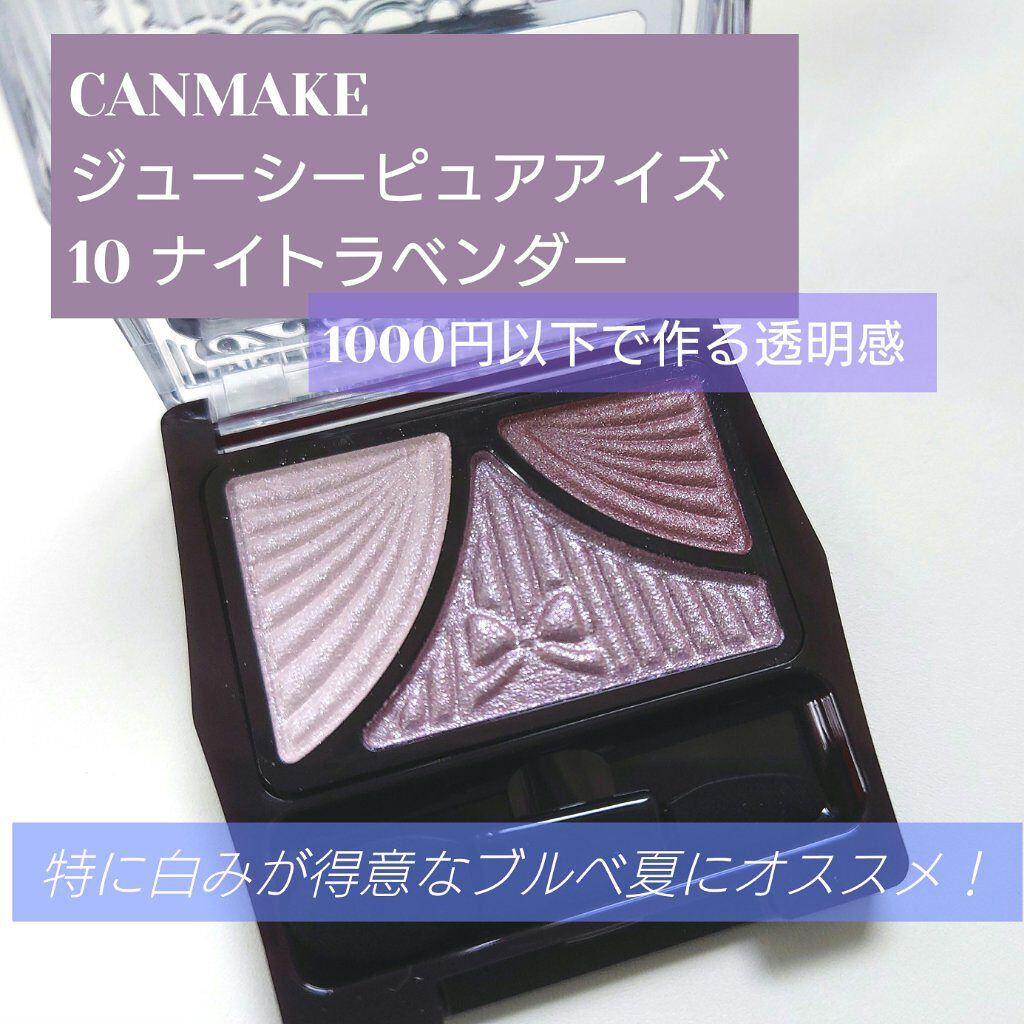 ୨୧⑅*.CANMAKEジューシーピュアアイズNo.10ナイトラベンダーブルベ夏にピッタリとのクチコミから、パープル系のNo.10の色味を購入しました。▪使い方左上:白みの強い細かいラメで、公式だとベースカラーとして使用真ん中:くすみパープル...