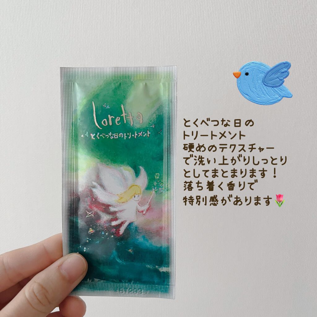 - ロレッタのヘアケアシリーズが3日間試せるトライアルセット。 セット内容: ・まいにちのすっきりシャンプー 10ml×3 ・すっきりしたい日のトリートメント 10g×2 ・とくべつな日のトリートメント 10g×1