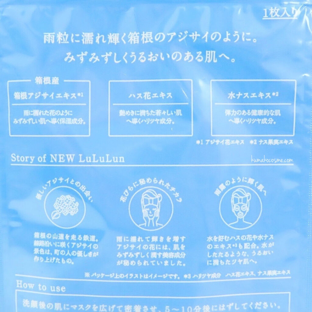 - 箱根ルルルン(しっとりアジサイの香り)は、雨のなかしっとりと咲き誇るあじさいのように、みずみずしく潤いのある肌に導きます。 今回はオリジナル成分の「アジサイ花エキス」のほか、「ハス花エキス」「ナス果実エキス」を配合し、フェイスマスクで肌の土台を活性化させ、十分に潤いが満ちた肌の実現を目指しました。