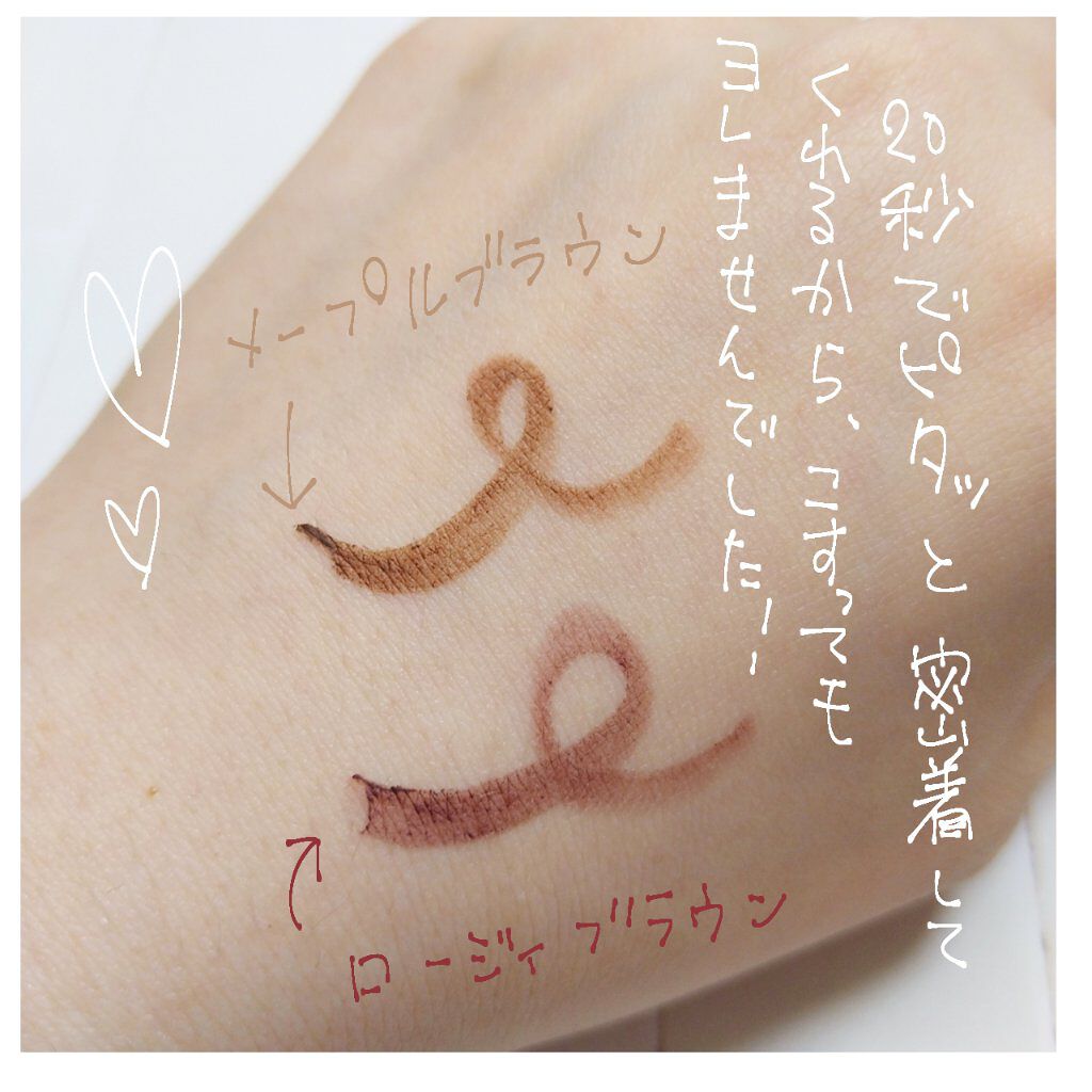 楕円形の芯で、かたすぎず柔らかすぎず、なめらかに描くことができます。 繰り戻しできるタイプなのもうれしい🙆 ウォータープルーフ&スマッジプルーフで非常に持ちが良く、 多少のことでは落ちません🙆 赤みのあるやわらかめのブラウンカラーもお気に入りです!