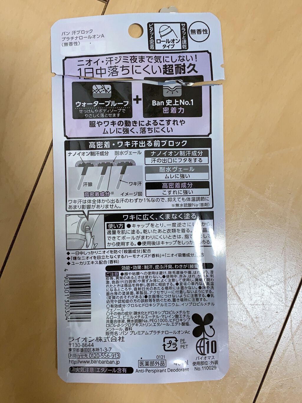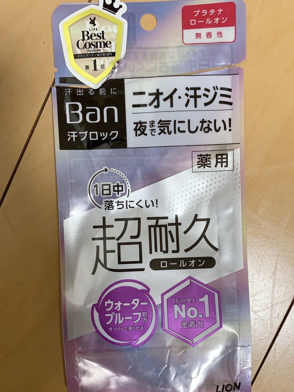 - Ban史上№1密着力の高機能アイテム 『Ban 汗ブロックプラチナロールオン』 ①「ウォータープルーフ処方+高密着成分配合」で、ムレ・こすれに強く、夜まで最強落ちない ②「ナノイオン制汗成分」が汗の出口にフタをして、ワキ汗を出る前にブロック ③「殺菌成分」でニオイ菌を殺菌し夜までワキのニオイをブロック ④「嫌なニオイを目立たなくするハーモナイズド香料」と「ニオイ吸着成分」配合。 ⑤サラッと速乾ロールオンタイプ ※せっけんやボディソープでやさしく落とせます。 ※ワキ汗は体全体から出る汗のわずか1%なので、抑えても体温調節にあまり影響がありません。 ※2022年1月〜パッケージリニューアル