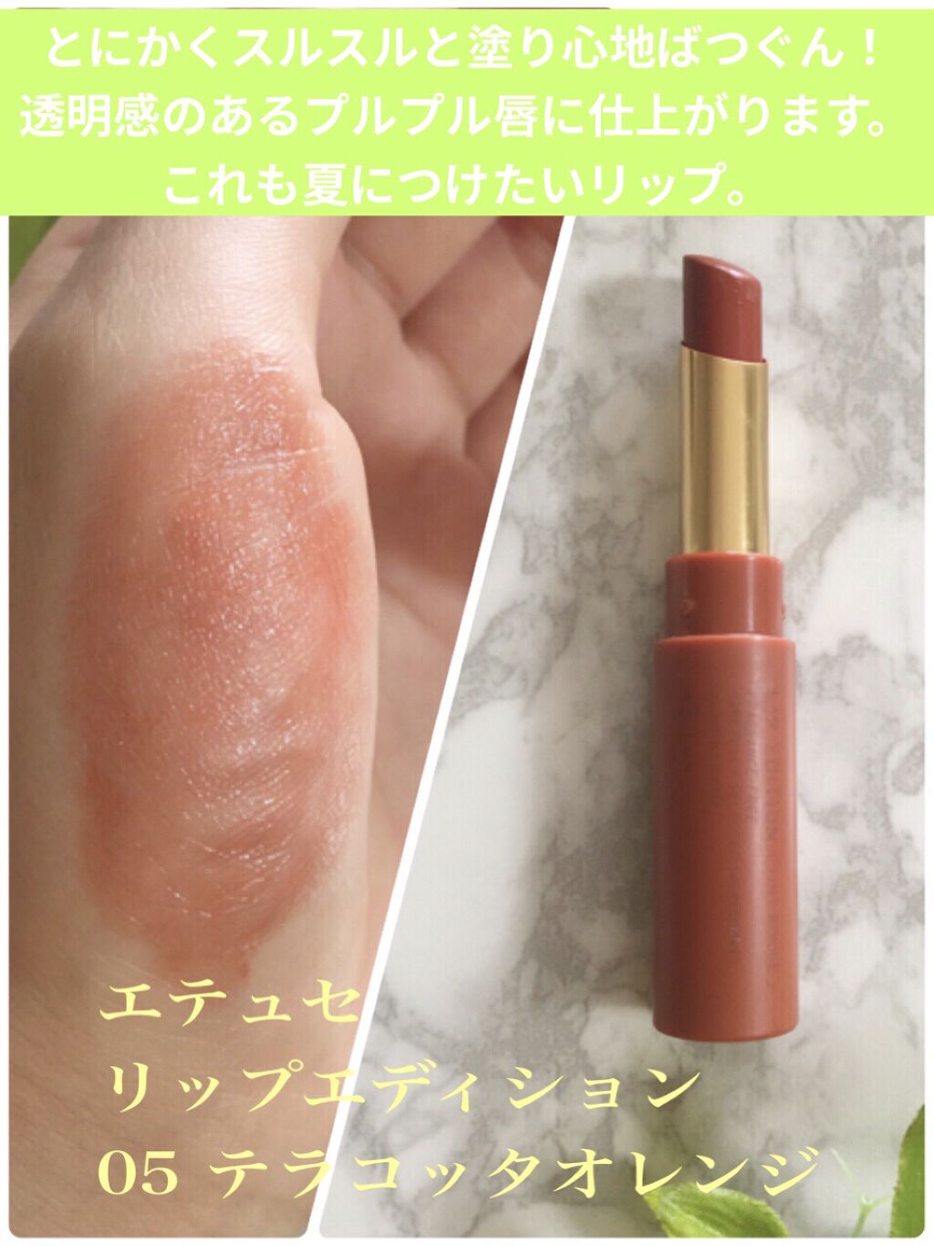 メルティールミナスルージュ、とろけるぬり心地が特徴的。 テラコッタ好きとしては、"04キャラメルテラコッタ"がイチオシ。 "06ビタールビーチョコレート"も可愛い印象のピンクブラウンで、つけやすくて大好きなカラー。 ティントタイプの"T02ロゼミルクティー"は、唇の色になじみやすいピンクブラウン。 "ステイオンバームルージュ"はバームタイプですけるような発色。 18ブラウニッシュマンダリンは、オレンジブラウン。 全部ふだんづかいしやすい可愛いカラーでおすすめですよ🎶