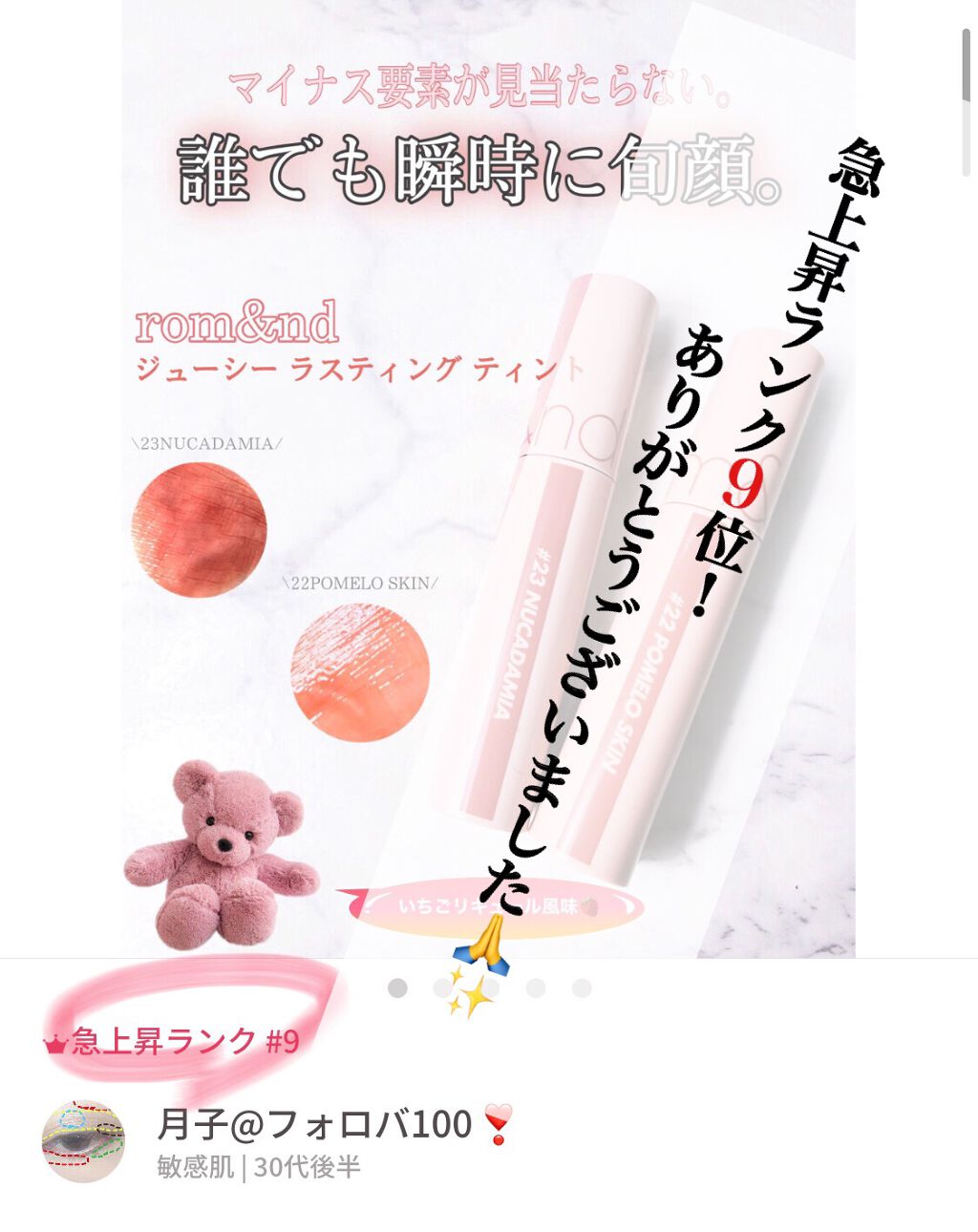 rom&nd ジューシーラスティングティント税込1,320円どれも使いやすいヌーディーカラー🤍⚠️今は商品がリニューアルして、カラー番号が変わってしまっています😓店舗によっては、まだリニューアル前の商品も置いているのですが、色味の参考にでもな...