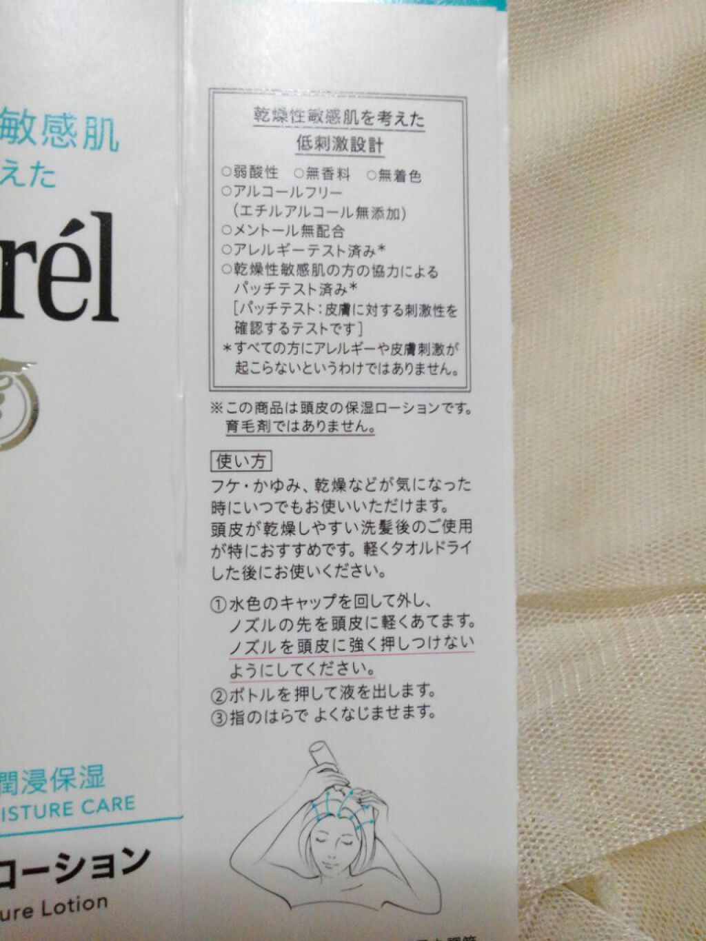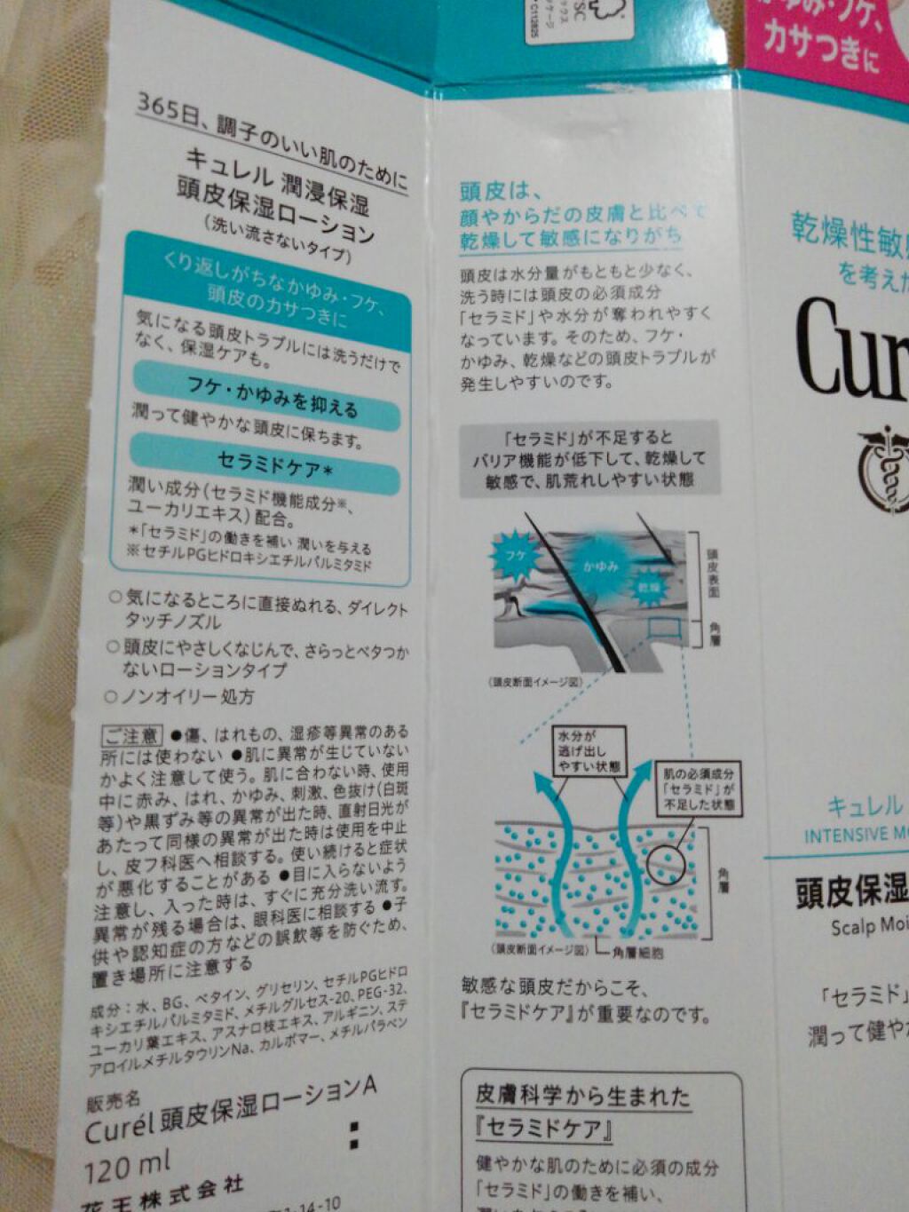 - 【敏感肌用】 くり返すかゆみ・フケ、カサつきに 敏感な頭皮こそ保湿ケアを。潤い成分(潤浸保湿セラミド機能成分*、ユーカリエキス)配合。「セラミド」の働きを補い、潤いを与えます。フケ・かゆみをおさえて、潤って健やかな頭皮に保ちます。 ●気になるところに直接ぬれる、ダイレクトタッチノズル。 ●頭皮にやさしくなじんで、さらっとベタつきにくいローションタイプ。 *セチルPGヒドロキシエチルパルミタミド 商品に関するお問い合わせ 受付時間9:00~17:00(土曜・日曜・祝日除く) *製品の誤飲・誤食など緊急の場合は、受付時間外でもお電話ください キュレル:0120-165-698