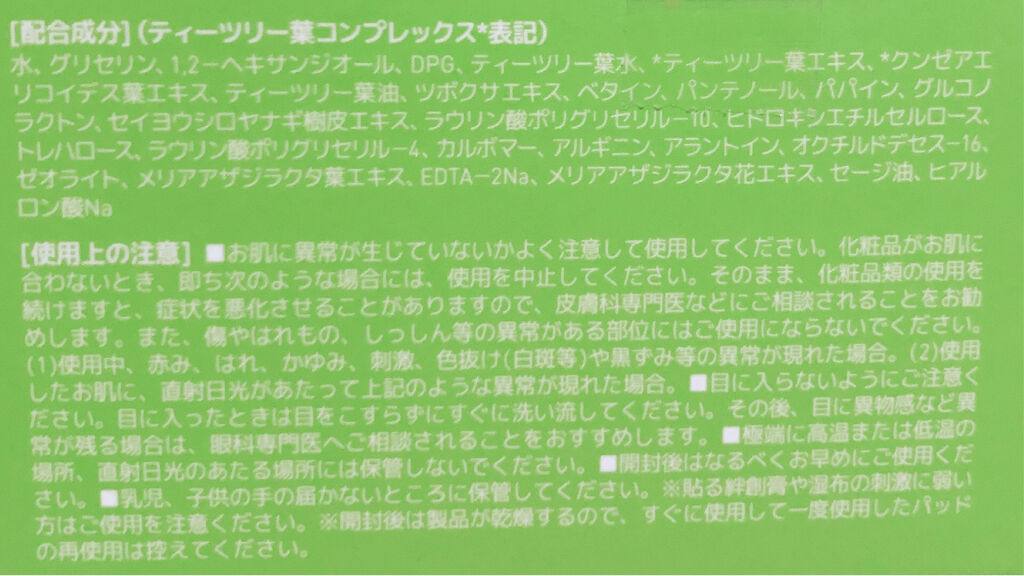 - <10枚入り> 水、グリセリン、1,2-ヘキサンジオール、DPG、ティーツリー葉水、ティーツリー葉エキス、クンゼアエリコイデス葉エキス、ティーツリー葉油、ツボクサエキス、ベタイン、パンテノール、パパイン、グルコノラクトン、セイヨウシロヤナギ樹皮エキス、ラウリン酸ポリグリセリル-10、ヒドロキシエチルセルロース、トレハロース、ラウリン酸ポリグリセリル-4、カルボマー、アルギニン、アラントイン、オクチルドデセス-16、ゼオライト、メリアアザジラクタ葉エキス、EDTA-2Na、メリアアザジラクタ花エキス、セージ油、ヒアルロン酸Na <50枚入り> 水、グリセリン、1,2-ヘキサンジオール、DPG、ティーツリー葉水、ティーツリー葉エキス、クンゼアエリコイデス葉エキス、ティーツリー葉油、ツボクサエキス、ベタイン、パンテノール、パパイン、グルコノラクトン、セイヨウシロヤナギ樹皮エキス、ラウリン酸ポリグリセリル-10、ヒドロキシエチルセルロース、トレハロース、ラウリン酸ポリグリセリル-4、カルボマー、アルギニン、アラントイン、オクチルドデセス-16、ゼオライト、メリアアザジラクタ葉エキス、EDTA-2Na、メリアアザジラクタ花エキス、セージ油、ヒアルロン酸Na