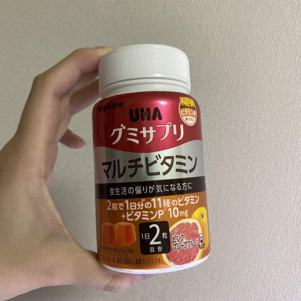 サプリメントはグミでとります。そうでないと続かないので。 UHA味覚糖のマルチビタミンはピンクグレープフルーツ味でおいしいです。少し硬めのグミです。 両方とも美味しいので続けられます。