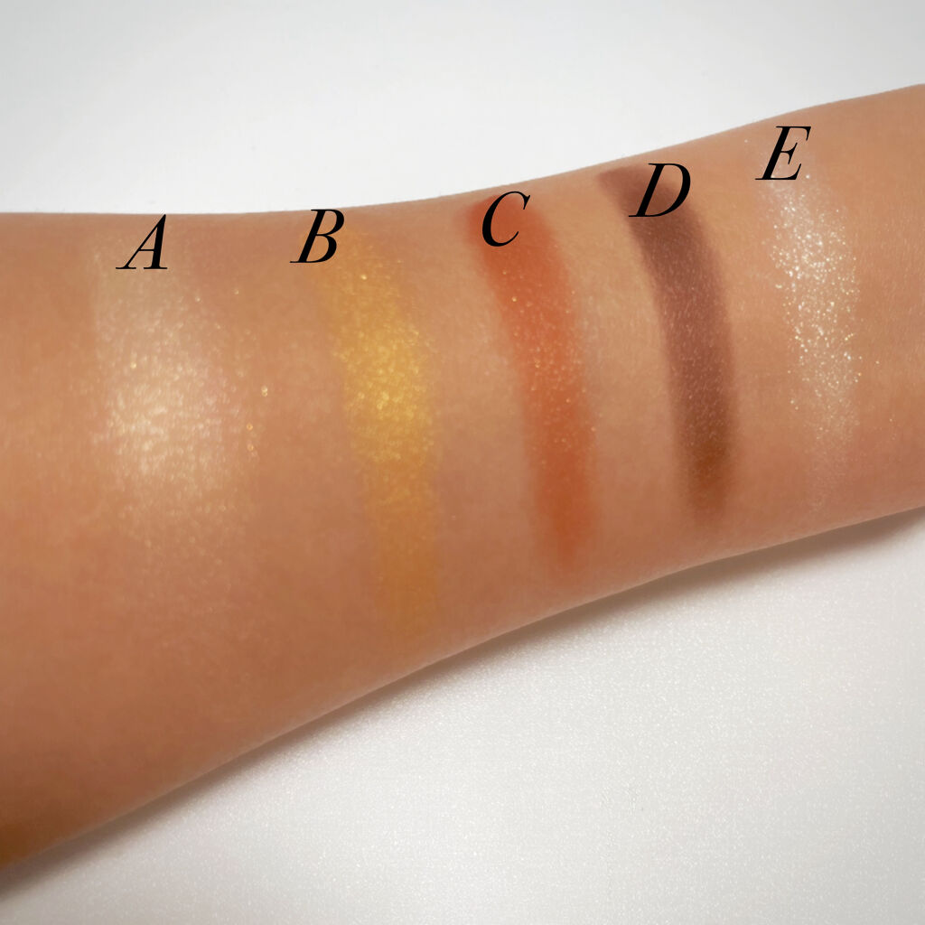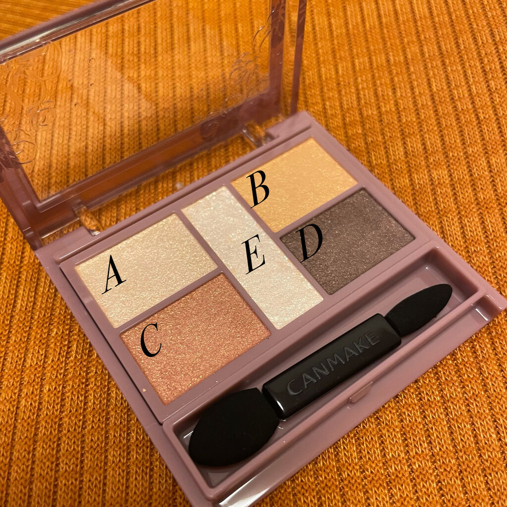 - 1枚のパレットで2つのスタイルが完成! 5色の欲ばりアイシャドウ♥ メインカラーを選んで2つのスタイルが楽しめる! A→B→D でスタイル1 A→C→D でスタイル2 繊細な粉質が、しっとりとまぶたに密着して色落ちを防ぎます。 透明感のあるキラうるトッピングジュエル(繊細ラメ)は、気分によってトッピング!