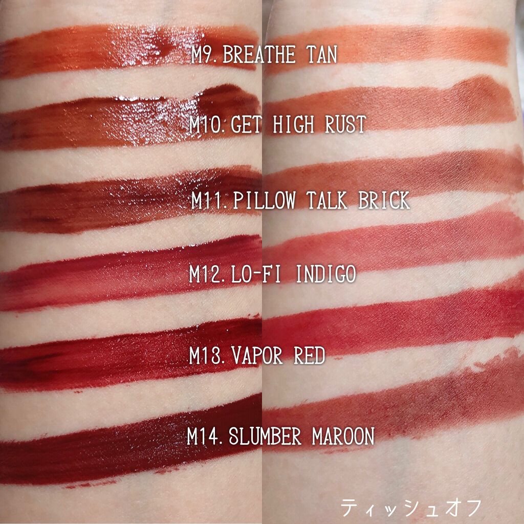 - <M11 ピロウトークブリック> ジメチコン、(ジメチコン/ビニルジメチコン)クロスポリマー、水、グリセリン、セチルPEG/PPG-10/1ジメチコン、トリイソステアリン酸ポリグリセリル-2、ペンチレングリコール、リンゴ酸ジイソステアリル、メチルトリメチコン、マイカ、シリカ、シクロペンタシロキサン、(アクリル酸ブチル/アクリル酸ヒドロキシプロピルジメチコン)コポリマー、イソドデカン、フェノキシエタノール、トリメチルシロキシケイ酸、(アクリル酸グリセリル/アクリル酸)コポリマー、ポリプロピルシルセスキオキサン、カプリリルグリコール、1,2-ヘキサンジオール、プロパンジオール、香料、エチルヘキシルグリセリン、ジメチルシリル化シリカ、水酸化Al、ダイウイキョウ果実エキス、メチコン、ワサビノキ種子油、アルガニアスピノサ核油、ヤシ油、シア脂、ハチミツエキス、BG、酸化チタン、酸化鉄、赤202、赤227、黄5、青1 <M12 ローファイインディゴ> ジメチコン、(ジメチコン/ビニルジメチコン)クロスポリマー、水、グリセリン、トリイソステアリン酸ポリグリセリル-2、セチルPEG/PPG-10/1ジメチコン、ペンチレングリコール、シクロペンタシロキサン、メチルトリメチコン、(アクリル酸ブチル/アクリル酸ヒドロキシプロピルジメチコン)コポリマー、イソドデカン、リンゴ酸ジイソステアリル、フェノキシエタノール、トリメチルシロキシケイ酸、(アクリル酸グリセリル/アクリル酸)コポリマー、マイカ、シリカ、ポリプロピルシルセスキオキサン、カプリリルグリコール、1,2-ヘキサンジオール、水酸化Al、プロパンジオール、香料、エチルヘキシルグリセリン、ジメチルシリル化シリカ、ダイウイキョウ果実エキス、メチコン、ワサビノキ種子油、アルガニアスピノサ核油、ヤシ油、シア脂、ハチミツエキス、BG、酸化チタン、酸化鉄、赤202、赤227、黄5、青1 <M13 ベイパーレッド> ジメチコン、(ジメチコン/ビニルジメチコン)クロスポリマー、水、グリセリン、トリイソステアリン酸ポリグリセリル-2、セチルPEG/PPG-10/1ジメチコン、ペンチレングリコール、メチルトリメチコン、リンゴ酸ジイソステアリル、(アクリル酸ブチル/アクリル酸ヒドロキシプロピルジメチコン)コポリマー、イソドデカン、フェノキシエタノール、トリメチルシロキシケイ酸、(アクリル酸グリセリル/アクリル酸)コポリマー、マイカ、シリカ、ポリプロピルシルセスキオキサン、カプリリルグリコール、シクロペンタシロキサン、1,2-ヘキサンジオール、プロパンジオール、香料、エチルヘキシルグリセリン、ジメチルシリル化シリカ、ダイウイキョウ果実エキス、メチコン、アルガニアスピノサ核油、ヤシ油、シア脂、ワサビノキ種子油、ハチミツエキス、BG、酸化鉄、赤104(1)、赤202、赤227、黄4、黄5、青1 <M14 ランバーマルーン> ジメチコン、(ジメチコン/ビニルジメチコン)クロスポリマー、水、トリイソステアリン酸ポリグリセリル-2、グリセリン、セチルPEG/PPG-10/1ジメチコン、リンゴ酸ジイソステアリル、ペンチレングリコール、シクロペンタシロキサン、メチルトリメチコン、(アクリル酸ブチル/アクリル酸ヒドロキシプロピルジメチコン)コポリマー、イソドデカン、フェノキシエタノール、トリメチルシロキシケイ酸、(アクリル酸グリセリル/アクリル酸)コポリマー、マイカ、シリカ、ポリプロピルシルセスキオキサン、カプリリルグリコール、1,2-ヘキサンジオール、プロパンジオール、香料、エチルヘキシルグリセリン、ジメチルシリル化シリカ、ダイウイキョウ果実エキス、メチコン、アルガニアスピノサ核油、ヤシ油、シア脂、ワサビノキ種子油、ハチミツエキス、BG、酸化鉄、赤202、赤227、黄5、青1 <M15 ウェアリーシロップ> ジメチコン、(ジメチコン/ビニルジメチコン)クロスポリマー、水、グリセリン、セチルPEG/PPG-10/1ジメチコン、シクロペンタシロキサン、トリイソステアリン酸ポリグリセリル-2、ペンチレングリコール、メチルトリメチコン、リンゴ酸ジイソステアリル、(アクリル酸ブチル/アクリル酸ヒドロキシプロピルジメチコン)コポリマー、イソドデカン、フェノキシエタノール、トリメチルシロキシケイ酸、(アクリル酸グリセリル/アクリル酸)コポリマー、マイカ、シリカ、ポリプロピルシルセスキオキサン、カプリリルグリコール、1,2-ヘキサンジオール、プロパンジオール、香料、エチルヘキシルグリセリン、水酸化Al、ジメチルシリル化シリカ、ダイウイキョウ果実エキスメチコン、ヤシ油、シア脂、ワサビノキ種子油、アルガニアスピノサ核油、ハチミツエキス、BG、酸化チタン、酸化鉄、赤202、赤227、黄5、青1 <M16 デイズシナモン> ジメチコン、(ジメチコン/ビニルジメチコン)クロスポリマー、水、グリセリン、セチルPEG/PPG-10/1ジメチコン、トリイソステアリン酸ポリグリセリル-2、シクロペンタシロキサン、ペンチレングリコール、メチルトリメチコン、リンゴ酸ジイソステアリル、マイカ、シリカ、(アクリル酸ブ