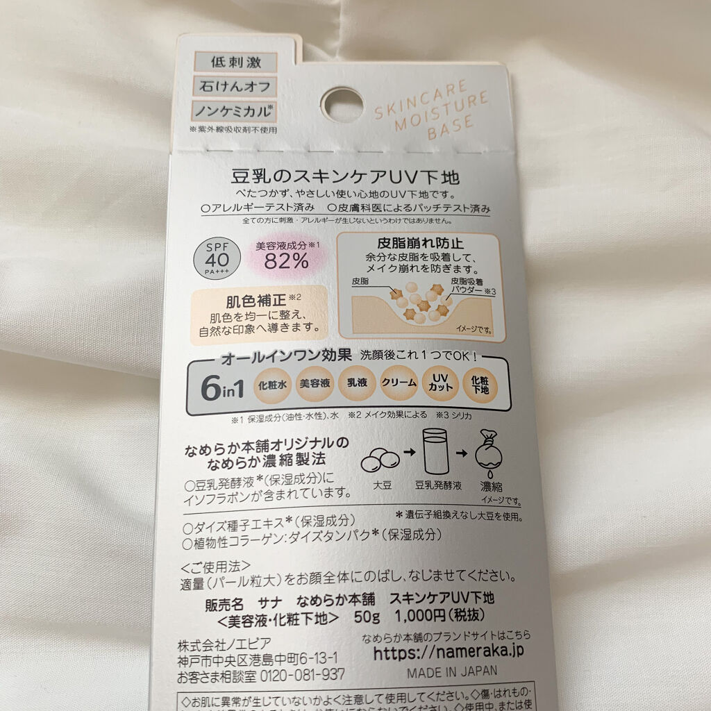 - <スキンケアUV下地> 豆乳のスキンケアUV下地。低刺激&ノンケミカル(紫外線吸収剤不使用)。肌色補正(メイク効果による)&皮脂崩れ防止。化粧水・美容液・乳液・クリーム・UVカット・化粧下地の1本6役。SPF40・PA+++。
