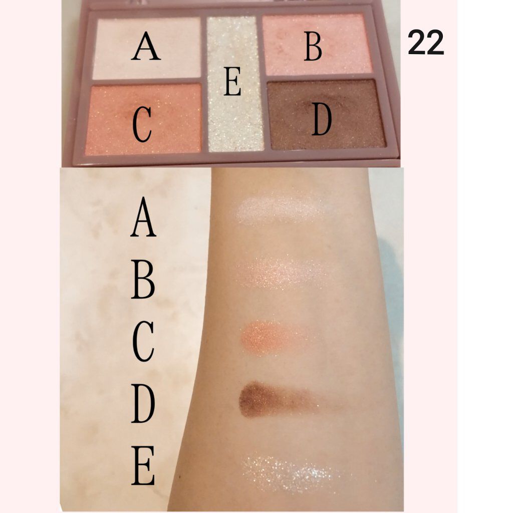 - 1枚のパレットで2つのスタイルが完成! 5色の欲ばりアイシャドウ♥ メインカラーを選んで2つのスタイルが楽しめる! A→B→D でスタイル1 A→C→D でスタイル2 繊細な粉質が、しっとりとまぶたに密着して色落ちを防ぎます。 透明感のあるキラうるトッピングジュエル(繊細ラメ)は、気分によってトッピング!