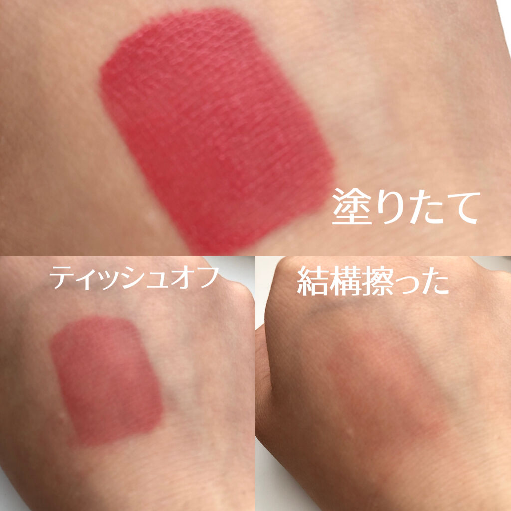 こちらのカラーが本当に大好きです!普段使いにぴったりで、軽いテクスチャーが唇に心地よいです。しっかり定着するとマスクやストローなどに移らず、長時間キープしてくれます。唇が乾燥したり、唇の質感が強調されることもなく、ほんのりとした自然なステインが残るのも魅力的です。 油分のある食べ物を食べると少し色移りすることがあります。そして、ドラッグストアコスメとしては少しお高めかもしれません。でも、このクオリティなら納得です!
