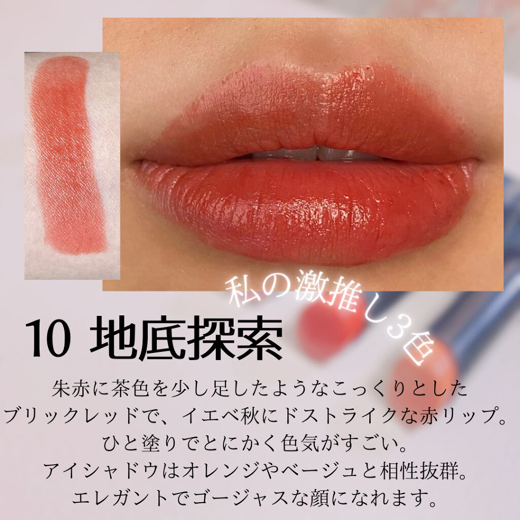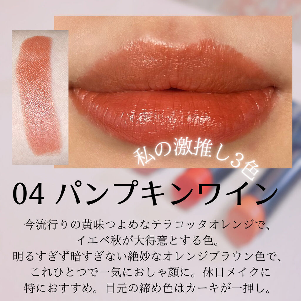 01 こっそりピンク使いやすい可愛いピンクベージュ。仕事にもデートにも使えるオールラウンダーで、一本持っておくと損はないです✨ 02 ふいうちレッド奇抜すぎず深すぎない絶妙なコーラルレッド。ほんのりくすんでいて、めちゃくちゃ使いやすいです!イエベ秋の私はこれが1番好き😍 03 じらしプラム少し大人っぽいけどダークすぎない、こちらも絶妙なプラム!少し青みがかっていて、(濃い色が得意な)ブルベさんには特に◎ 04 ほろよいピンク(新色)The 美少女〜!なピュア感あるピンク。01と似ていますが、01がピンクベージュなのに対して、04はベビーピンクという感じで、より無垢な感じのイメージになります!とても可愛いですね〜〜😍 05 きづいてテラコッタ待望のテラコッタカラーがキタ!!!テラコッタというと結構深みのあるオレンジブラウンが多いですが、こちらは春夏にも使いやすい明るめのオレンジベージュ✨これを塗ると一気におしゃれになります…アカリンさすがすぎる。