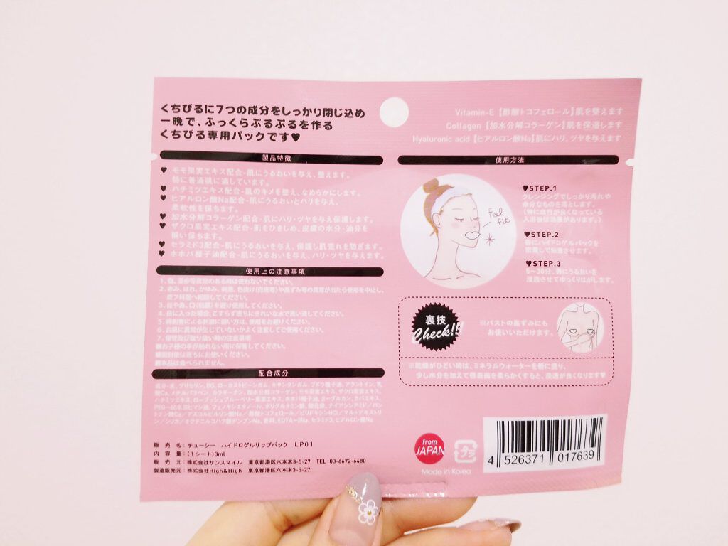 - 乾燥や皮むけなどが気になりがちな「くちびる」のために開発した、専用パック。密着性の高いハイドロゲルがくちびるに保湿成分をしっかり密封させ、角質層まで浸透。 SNSでもグローバルに注目されている、キュートで、しかも高機能な人気アイテム♪ ●血行が良くなっている入浴後のリップケアに ●特別な日のメイク前に ●皮膚のターンオーバー周期(約5~7日)に合わせた週1のリップケアに ●貼るだけ密着、プルプル保湿 ●気分や好みで選べる!5つの香り ・ピーチ ・ミルク ・ハニー ・フルーツ ・ハーブ <使用方法> 1. クレンジングで、くちびるに残ったメイクや汚れをしっかり落としてから、 くちびるにリップパックを密着させます。 2. 5~10分間、くちびるにうるおいを浸透させてから、ゆっくりとはがします。 ※ ひどい乾燥時にはミネラルウォーターをくちびるに塗って、表面を柔らかくしてから使用すると、保湿成分の浸透力アップ。
