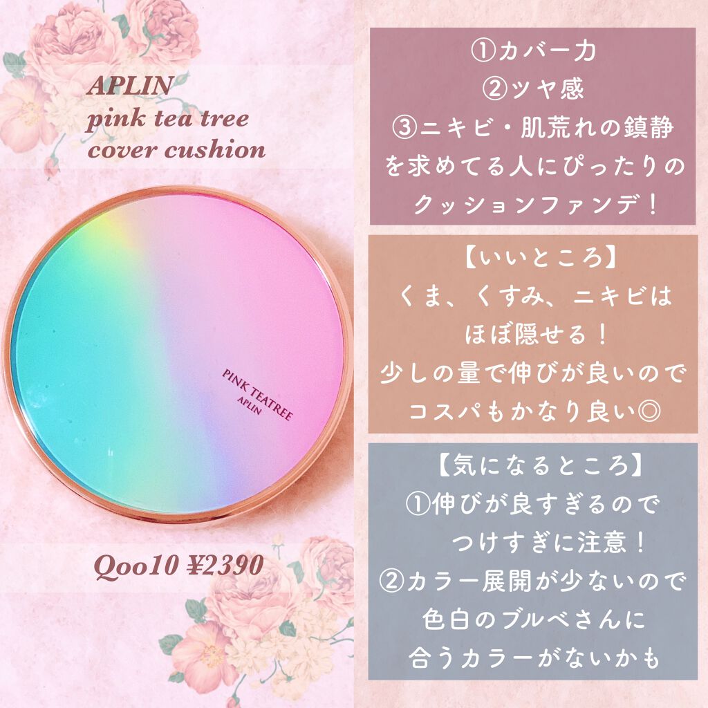 APLIN ピンクティーツリーカバークッション 21号ライトベージュ 2,490円(税込) 少量でよく伸びてハイカバー! 赤みやくすみをしっかりカバ一できるのに、厚塗り感のないなめらかな仕上がり♡ ハイカバーなのにナチュラルなツヤ感とサラッとしつつ、乾燥崩れしにくい仕上がりに感動します!!