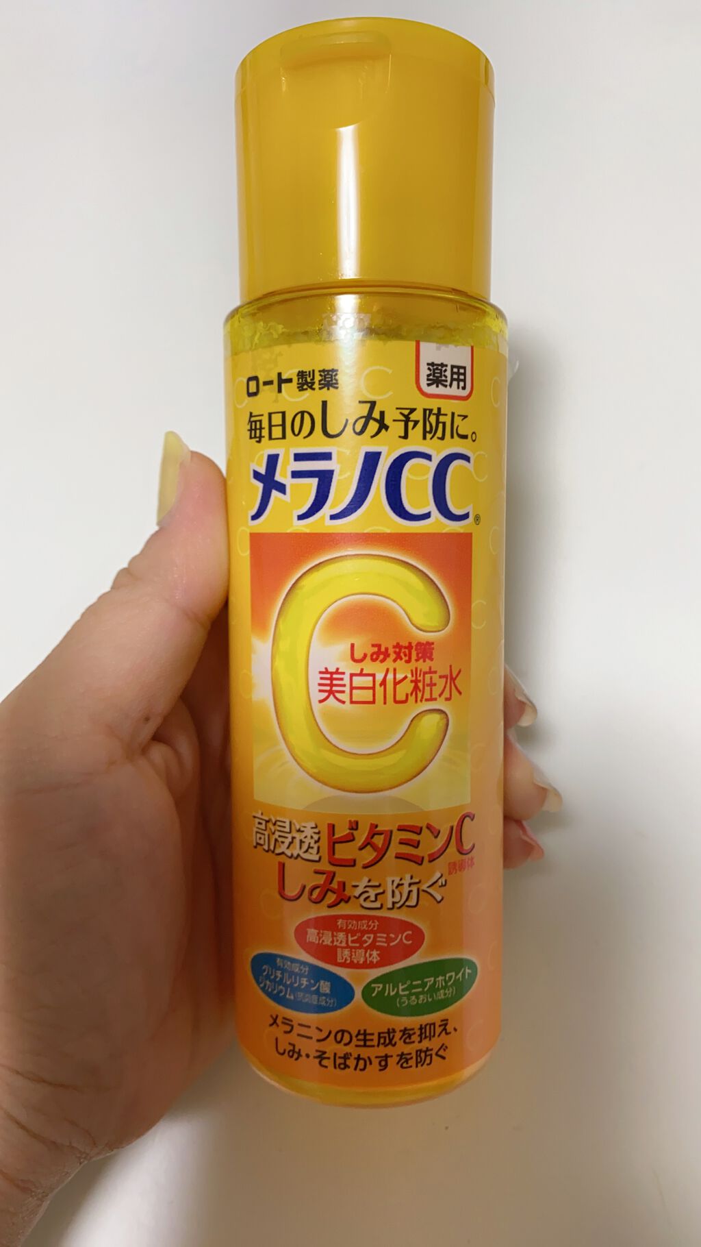 - 「メラノCC 薬用しみ対策 美白化粧水」は、顔全体にうるおいを与えながら、しみ対策できる薬用美白化粧水。 美白有効成分高浸透ビタミンC誘導体*1が角質層すみずみまで浸透し、メラニンの生成を抑え、しみ・そばかすを防ぎ、透明感のある肌へと導きます。 また、抗炎症成分*2と3種のうるおい成分*3を配合。ニキビ痕が気になる肌にもうるおいを与え、肌を整えます。 さわやかな柑橘系の香りです。 *1:3-O-エチルアスコルビン酸 *2:グリチルリチン酸ジカリウム *3:アルピニアホワイト、レモンエキス、グレープフルーツエキス