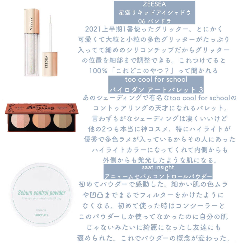 ゆうさんこんばんは🌙藍です! 上半期、今日で終わりますね… まとめ方がお上手です👏私の上半期ベスコス…沢山買いすぎてなかなかまとめられません笑笑