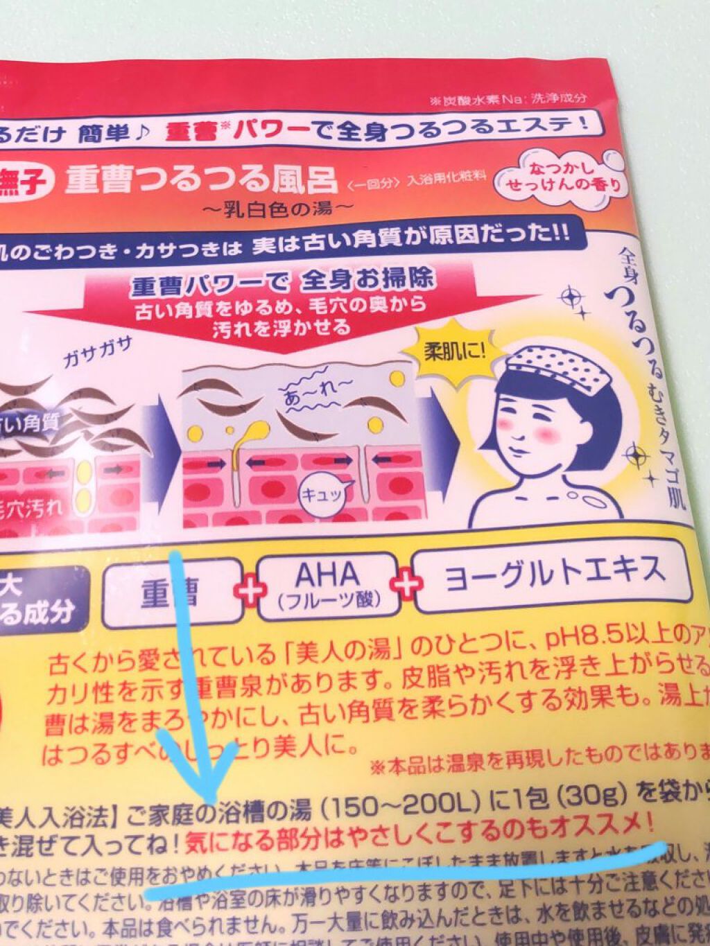- 重曹パワーで全身つるつるエステ!皮脂や汚れを浮き上がらせる重曹は湯をまろやかにし、古い角質をやわらかくする効果も。さらにAHA(フルーツ酸)が厚く積もった角質をやさしくピーリング。●ヨーグルトエキスがうるおいをあたえながら、なめらかでスベスベの肌に整えます。全身つるつるむきタマゴ肌に。なつかし石けんの香り。乳白色の湯。 ※重曹:炭酸水素Na(洗浄成分)