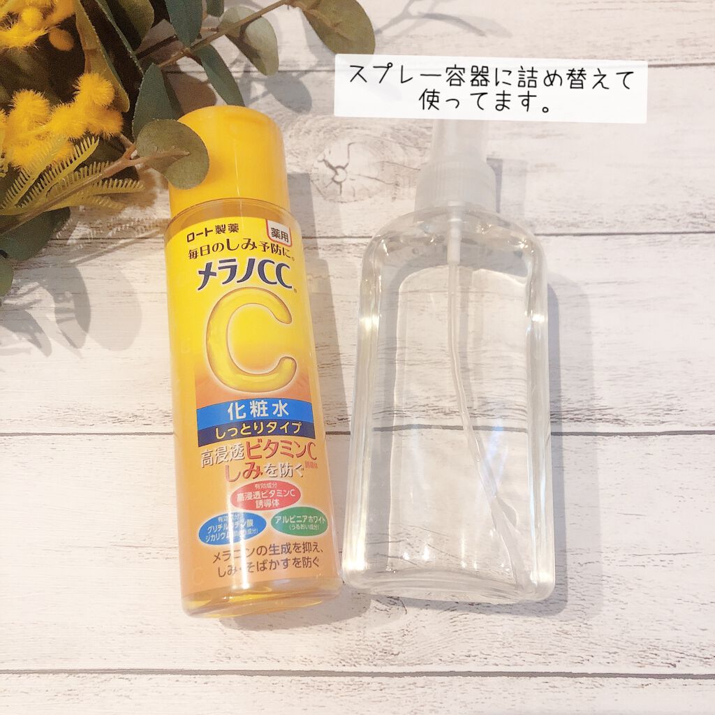 - 「メラノCC 薬用しみ対策 美白化粧水 しっとりタイプ」は、顔全体にうるおいを与えながら、しみ対策できる薬用美白化粧水。 美白有効成分の高浸透ビタミンC誘導体*1が角質層のすみずみまで浸透し、メラニンの生成を抑え、しみ・そばかすを防ぎ、透明感のある肌へと導きます。 また、抗炎症成分*2と3種のうるおい成分*3を配合。ニキビ痕が気になる肌にもうるおいを与え、肌を整えます。 さわやかな柑橘系の香りです。 *1:3-O-エチルアスコルビン酸 *2:グリチルリチン酸ジカリウム *3:アルピニアホワイト、レモンエキス、グレープフルーツエキス