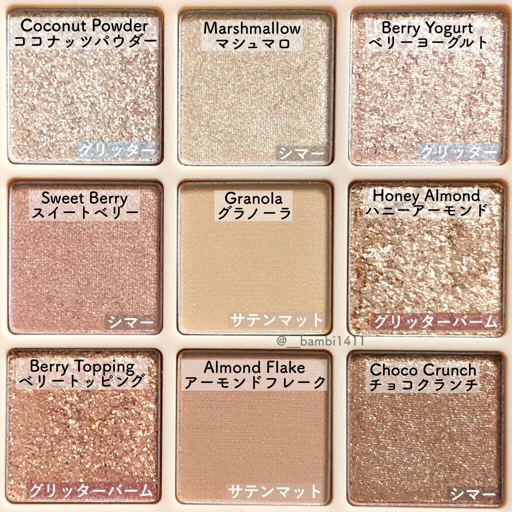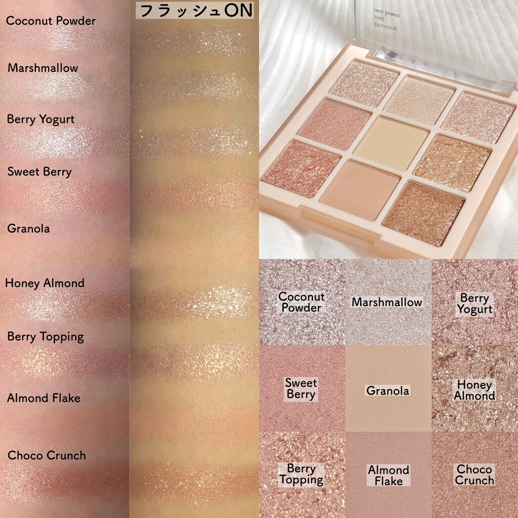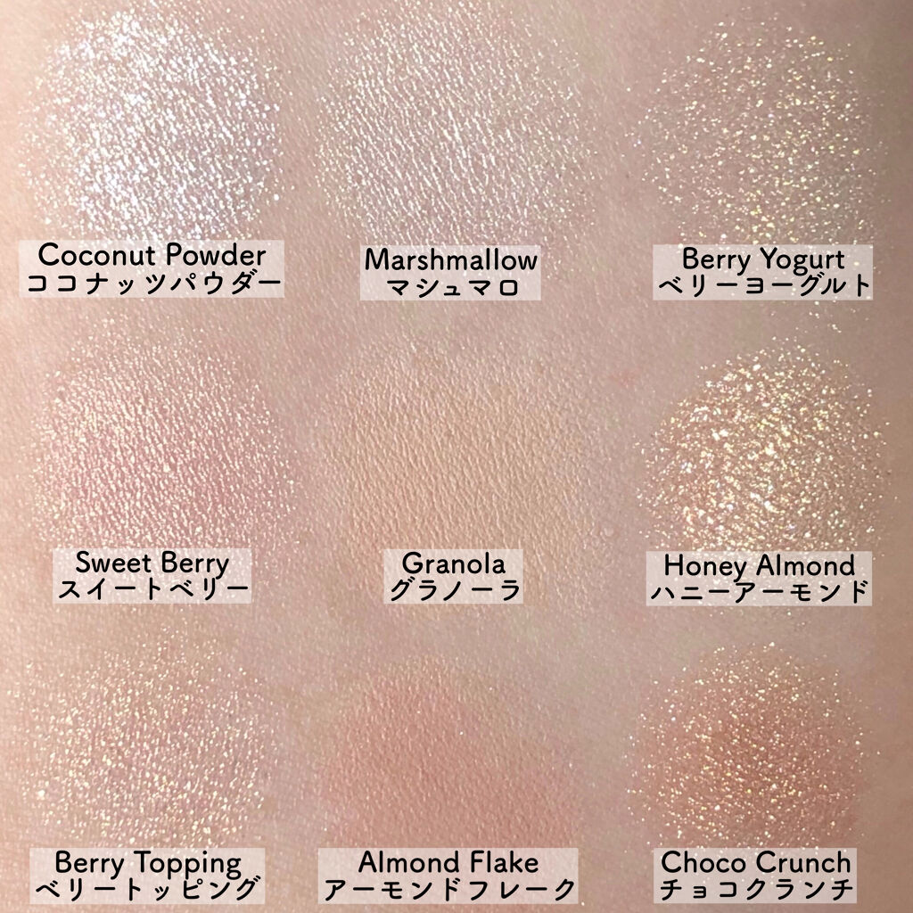 - <01 シュガーブラウニー> タルク、マイカ、ジメチコン、酸化鉄、ホウケイ酸(Ca/チタン)、イソドデカン、合成フルオロフロゴパイト、ホウケイ酸(Ca/Al)、酸化チタン、ステアロイルオキシステアリン酸オクチルドデシル、シリカ、フェニルトリメチコン、メタクリル酸メチルクロスポリマー、ジエチルヘキサン酸ネオペンチルグリコール、ミリスチン酸Mg、メチルプロパンジオール、ナイロン-12、(ビニルジメチコン/メチコンシルセスキオキサン)クロスポリマー、プロパンジオール、ステアリン酸Mg、ラウリン酸ヘキシル、(ジメチコン/ビニルジメチコン)クロスポリマー、マカデミア種子油、マンガンバイオレット、リンゴ酸ジイソステアリル、(ヘキシルデカン酸/セバシン酸)ジグリセリルオリゴエステル、ヘキサ(ヒドロキシステアリン酸/ステアリン酸/ロジン酸)ジペンタエリスリチル、セスキイソステアリン酸ソルビタン、テトラ(ヒドロキシステアリン酸/イソステアリン酸)ジペンタエリスリチル、ホウケイ酸(Ca/Na)、ステアリン酸ジメチコノール、トリエトキシカプリリルシラン、カルミン、サラソウジュ種子脂、ジフェニルシロキシフェニルトリメチコン、ジイソステアリン酸ポリグリセリル-3、黄4、赤226、合成ワックス、酸化スズ、グンジョウ、ラウロイルリシン、メチコン、水 <02 ローズペタル> タルク、マイカ、ジメチコン、ホウケイ酸(Ca/チタン)、酸化チタン、ホウケイ酸(Ca/Al)、合成フルオロフロゴパイト、酸化鉄、ナイロン-12、トリエチルヘキサノイン、シリカ、ホウケイ酸(Ca/Na)、メタクリル酸メチルクロスポリマー、ジエチルヘキサン酸ネオペンチルグリコール、ミリスチン酸Mg、フェニルトリメチコン、トリイソステアリン酸ポリグリセリル-2、ステアロイルオキシステアリン酸オクチルドデシル、ステアリン酸Mg、メチルプロパンジオール、オクチルドデカノール、マンガンバイオレット、赤226、リンゴ酸ジイソステアリル、ヘキサ(ヒドロキシステアリン酸/ステアリン酸/ロジン酸)ジペンタエリスリチル、プロパンジオール、ラウリン酸ヘキシル、マカデミア種子油、イソステアリン酸水添ヒマシ油、(ジメチコン/ビニルジメチコン)クロスポリマー、窒化ホウ素、カルミン、(ヘキシルデカン酸/セバシン酸)ジグリセリルオリゴエステル、ネオペンタン酸イソステアリル、グンジョウ、セスキイソステアリン酸ソルビタン、(HDI/トリメチロールヘキシルラクトン)クロスポリマー、ポリブテン、酸化スズ、トリエトキシカプリリルシラン、フェノキシエタノール、ラウロイルリシン、ステアリン酸ジメチコノール、合成ワックス、黄5、黄4、水添レシチン、メチコン、コンジョウ、水 <03 ヌードポーション> タルク、マイカ、ポリブチレンテレフタレート、ビスジグリセリルポリアシルアジペート-2、ジメチコン、ホウケイ酸(Ca/チタン)、ホウケイ酸(Ca/Al)、シリカ、酸化チタン、アクリレーツコポリマー、(エチレン/VA)コポリマー、酸化鉄、合成フルオロフロゴパイト、ナイロン-12、トリイソステアリン酸ポリグリセリル-2、イソドデカン、ホウケイ酸(Ca/Na)、ステアロイルオキシステアリン酸オクチルドデシル、フェニルトリメチコン、マンガンバイオレット、メチルプロパンジオール、オクチルドデカノール、メタクリル酸メチルクロスポリマー、プロパンジオール、ヘキサ(ヒドロキシステアリン酸/ステアリン酸/ロジン酸)ジペンタエリスリチル、マカデミア種子油、リンゴ酸ジイソステアリル、ミリスチン酸Mg、ステアリン酸ジメチコノール、ステアリン酸Mg、ジエチルヘキサン酸ネオペンチルグリコール、トリエトキシカプリリルシラン、水添レシチン、ラウリン酸ヘキシル、カルミン、(ジメチコン/ビニルジメチコン)クロスポリマー、(ヘキシルデカン酸/セバシン酸)ジグリセリルオリゴエステル、セスキイソステアリン酸ソルビタン、酸化スズ、フェノキシエタノール、合成ワックス、メチコン、黄4、グンジョウ、水 <09 スイートシリアル> タルク、ホウケイ酸(Ca/チタン)、マイカ、酸化チタン、ホウケイ酸(Ca/Al)、ホウケイ酸(Ca/Na)、ビスジグリセリルポリアシルアジペート-2、合成フルオロフロゴパイト、オクテニルコハク酸デンプンAl、フェニルトリメチコン、窒化ホウ素、トリ(カプリル酸/カプリン酸)グリセリル、ポリブチレンテレフタレート、ナイロン-12、ステアロイルオキシステアリン酸オクチルドデシル、トリイソステアリン酸ポリグリセリル-2、酸化鉄、ミリスチン酸Mg、アクリレーツコポリマー、ジメチコン、メチルプロパンジオール、シリカ、ステアリン酸Mg、(エチレン/VA)コポリマー、ジエチルヘキサン酸ネオペンチルグリコール、ヘキサ(ヒドロキシステアリン酸/ステアリン酸/ロジン酸)ジペンタエリスリチル、プロパンジオール、(ジフェニルジメチコン/ビニルジフェニルジメチコン/シルセスキオキサン)クロスポリマー、リンゴ酸ジイソステアリル、ポリブテン、メタクリル酸メチルクロスポリマー、ステ