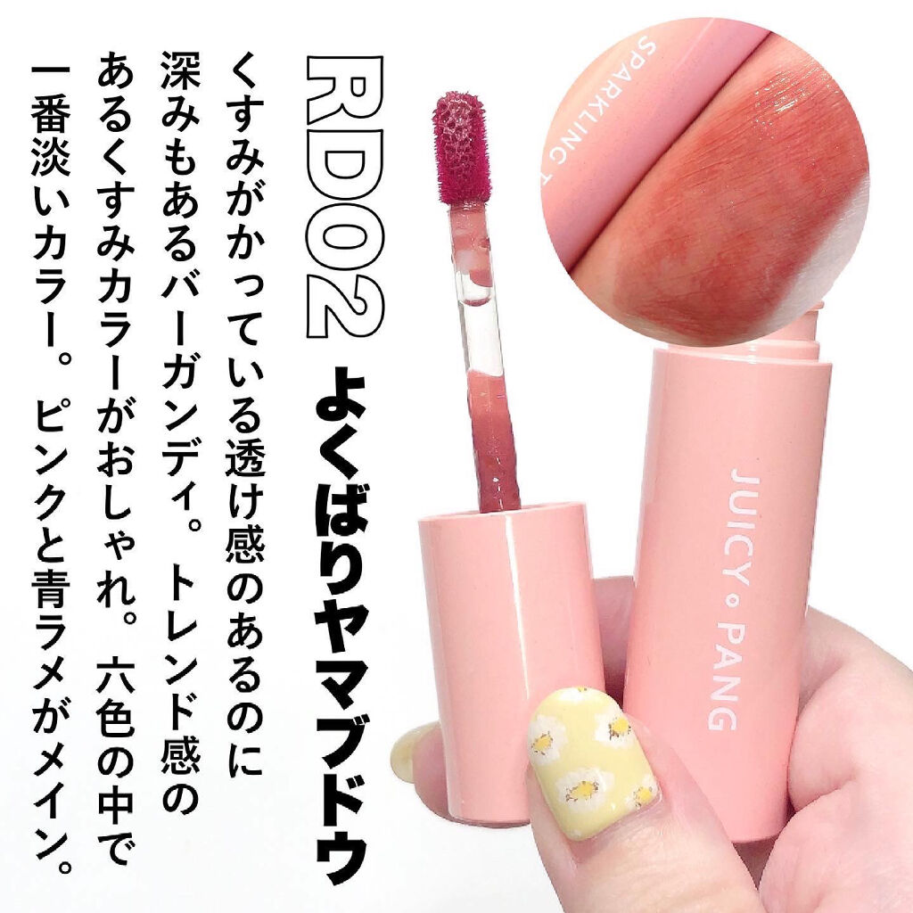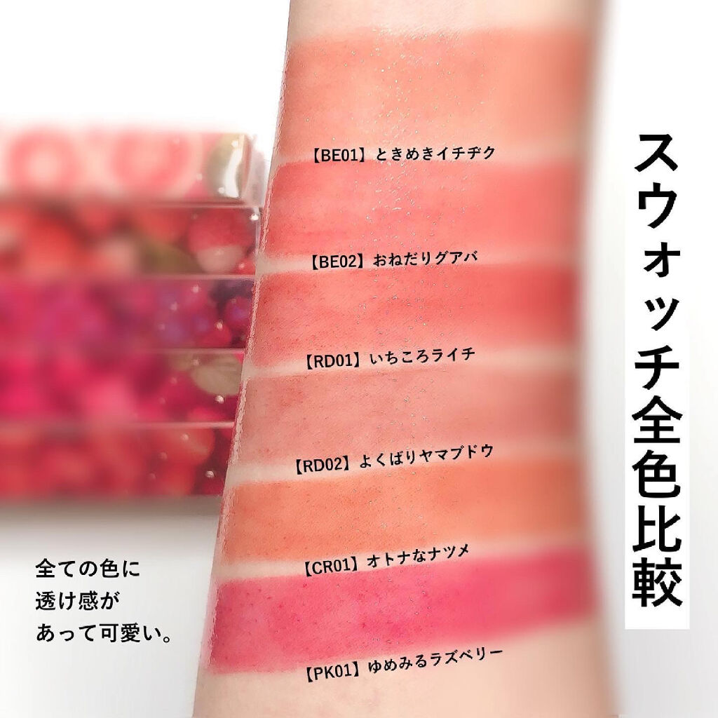 - Point 1 ジューシーなもぎたて果実のような発色が長時間続く Point 2 キラキラ輝くスパークリングジュエリーパウダー配合 Point 3 リップケアオイル配合で、クリアな光沢感のある仕上がり RD03、CR02は公式オンライン限定発売