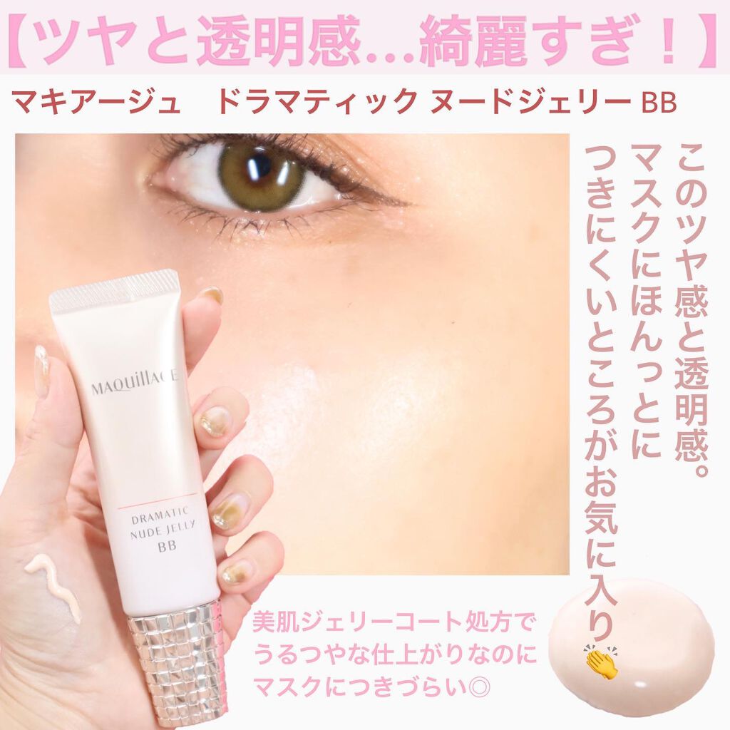 - 薄づきなのに毛穴・色ムラをカバーし、スキンケア直後のような透明うるつや肌へ。 マスクにもつきにくいマキアージュのヌードジェリー BB。 うるおいをたっぷり含んだジェリーが肌をうるおわせながらつやと透明感のある仕上がりを持続。 ジェリーがみずみずしく広がり毛穴・色ムラを均一にカバー。 SPF50+ ・ PA+++ 13時間化粧もち*データ取得済み(メーカー調べ・効果には個人差があります) *(テカり・皮脂くずれ・毛穴落ち・よれ・薄れ)のなさ"