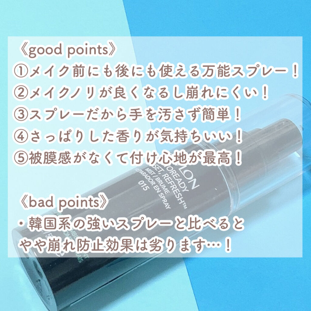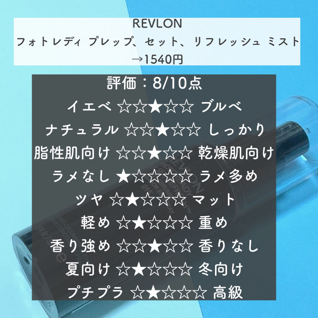 - SNSで人気の商品です! 3-in-1効果で、キレイが続く!メイクくずれ防止スプレー マスク着用が欠かせない今、キレイが長持ちする、メイクくずれ防止スプレーは必須アイテム。 『レブロン フォトレディ プレップ、 セット、 リフレッシュ ミスト』は、3つの効果が1つになった優れもの。 マスク蒸れが気になるこれからの季節、メイクくずれを気にせず、細かな霧状のミストが気分を爽やかにしてくれる頼もしいアイテムです。