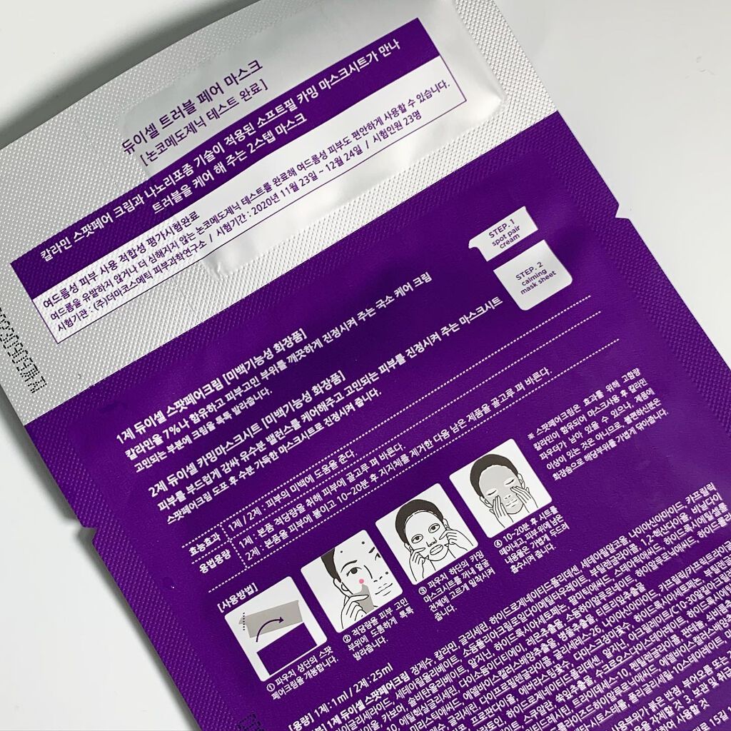 木から得られた天然植物性素材でできており、肌に優しいだけでなく環境にも優しいシートです。 水分の吸収が最適化するように、厚さを薄く細かくして使用時に優れた密着力と柔らかさを感じることができます✨ 使用してみて、マスクの薄さ驚きました! 密着力が本当に良くて鼻や凹凸部分にも綺麗にフィットしてくれます。 開けた時に美容液は少し少なめかな?と思ったんですが、ちょうどいい量で20分くらいつけるとしっかり美容液が肌に浸透していました! 鎮静効果と保湿効果をしっかりと感じることができました👏 お手頃価格なのに使用感も良くてかなり気に入りました〜💛