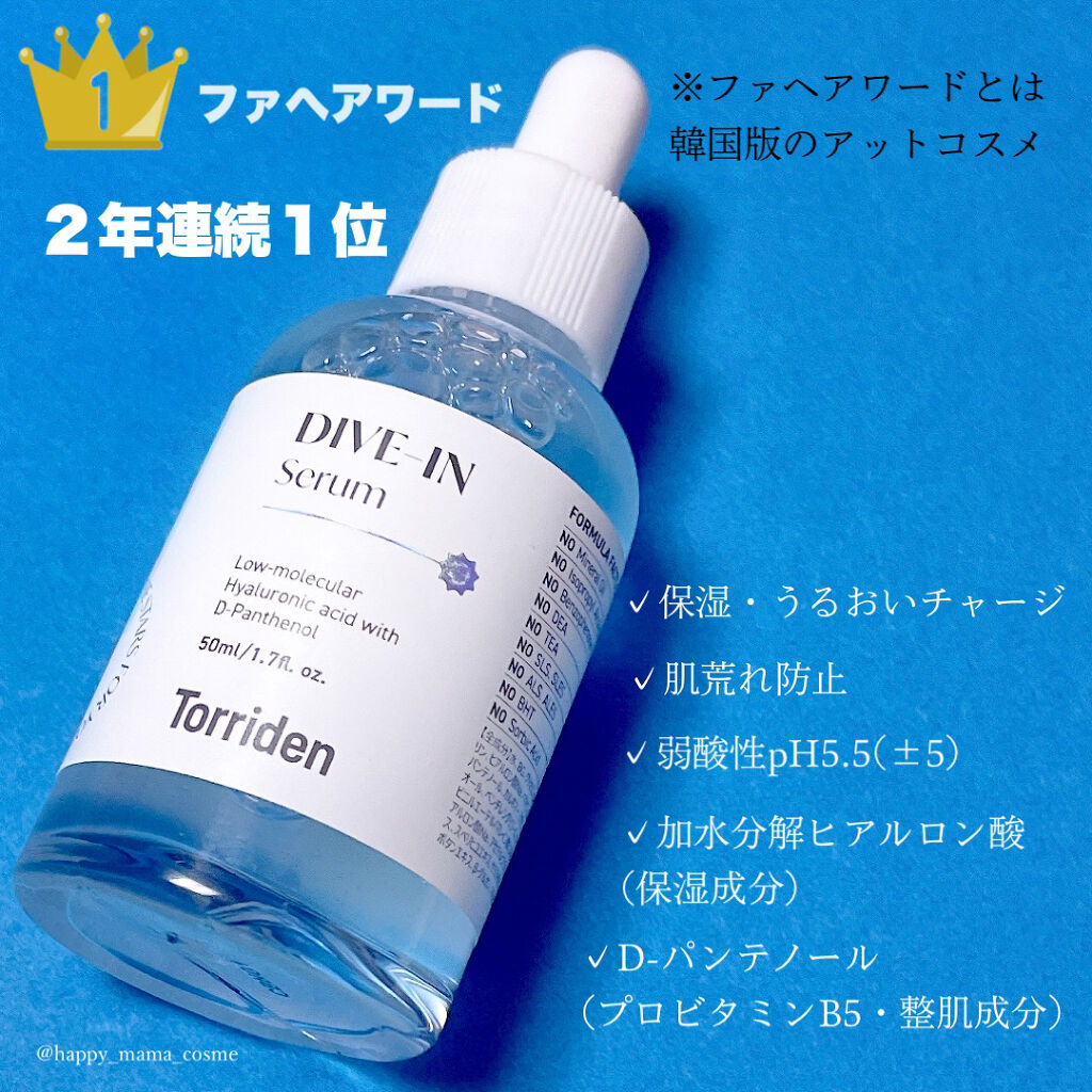 韓国コスメ評価アプリファヘビューティーアワード 3年連続1位* 2023年オリーブヤングアワード エッセンス/セラム部門3位受賞の実績もあって使うと納得する使い心地 シンプルな処方となっていて成分は5種類のヒアルロン酸やD-パンテノールアラントインだからどんなスキンケアとも相性が良く攻め系成分のスキンケアとも相性◎ ダイブインセラムの長所を1枚に詰め込んだダイブインマスク。 2つとも使用することで水分爆弾!!