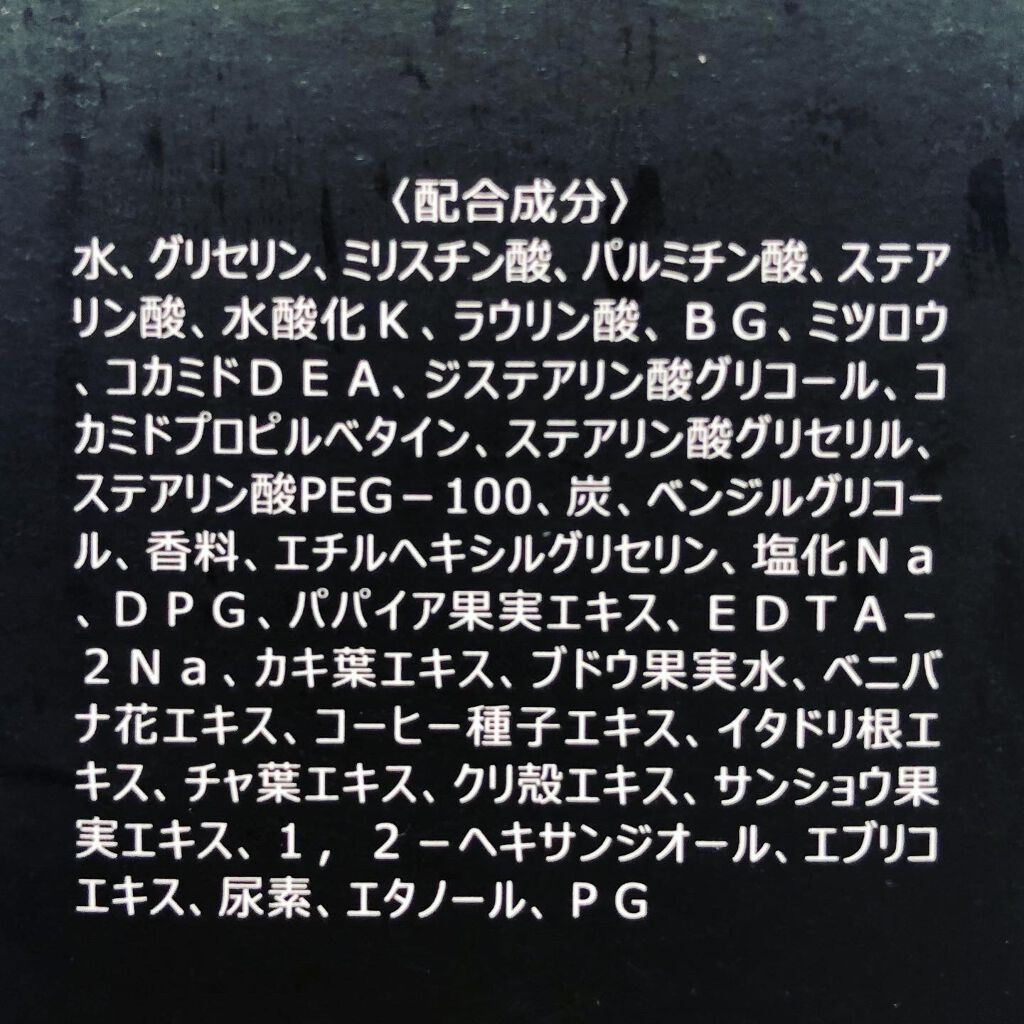 - 水、グリセリン、ミリスチン酸、パルミチン酸、ステアリン酸、水酸化K、ラウリン酸、BG、ミツロウ、コカミドDEA、ジステアリン酸グリコール、コカミドプロピルベタイン、ステアリン酸グリセリル、ステアリン酸PEG-100、炭、ベンジルグリコール、香料、エチルヘキシルグリセリン、塩化Na、DPG、パパイア果実エキス、EDTA-2Na、カキ葉エキス、ブドウ果実水、ベニバナ花エキス、コーヒー種子エキス、イタドリ根エキス、チャ葉エキス、クリ殻エキス、サンショウ果実エキス、1,2-ヘキサンジオール、エブリコエキス、尿素、エタノール、PG