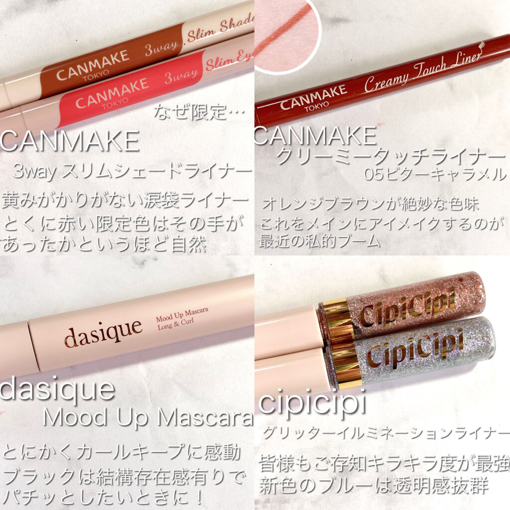 LIPS ベスコス 2024 リキッドアイライナー部門 1位 何度もリピしているお気に入りのキャンメイク クリーミータッチライナー アズキブラウンに似たカラーの描きやすいリキッドライナーを求めて買物へ! 描きやすく速乾 滲まない。 わたしが使ってきたリキッドライナーのなかでもっとも細くスッとまっすぐ描きやすい。 こちらのカラー以外もおしゃれで抜け感のあるカラーばかり! 今回はブラウンを探していた為こちらを選んだけどグレーカシミアも次回の候補。
