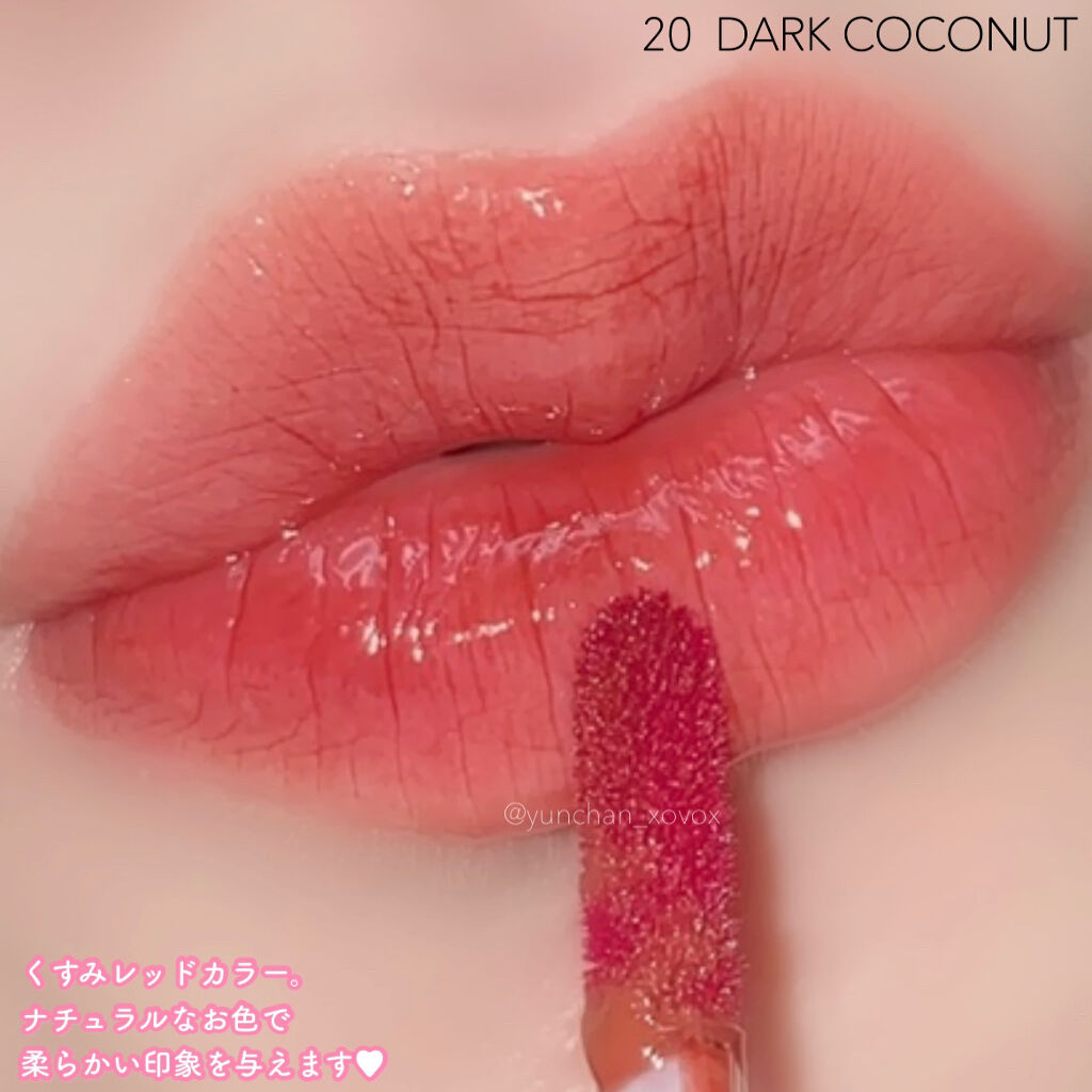 ロムアンドのジューシーラスティングティントで解決! 色持ちの良さは勿論のこと、ツヤ感やうるおいとも両立が可能です😄🌸 19 ALMOND ROSEはくすみ感のあるローズカラーでかわいくてお気に入り! 絶妙な色合いなのですが、元から血色の良い唇のように仕上げてくれ、ナチュラルになじんでくれるので何方でも使いやすいと思います。 20 DARK COCONUTは塗り重ねる程深みを出すことのできる、ダークなカラー。 チョコレートのような色味で、いつもよりも大人に、ちょっと背伸びをしたいなという時に特にオススメです。