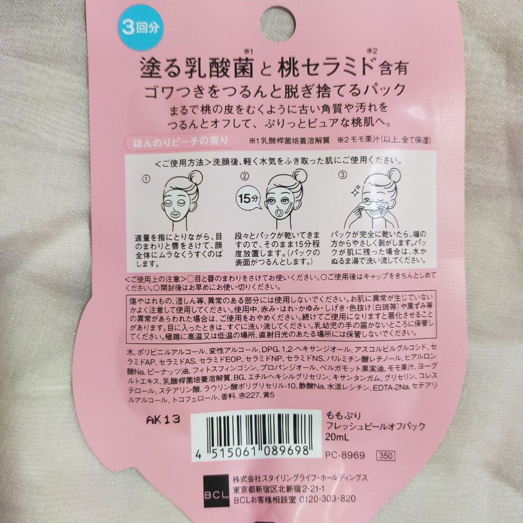 - <ももぷり フレッシュピールオフパック> 水、ポリビニルアルコール、変性アルコール、DPG、1,2-ヘキサンジオール、アスコルビルグルコシド、セラミドAP、セラミドAS、セラミドEOP、セラミドNP、セラミドNS、パルミチン酸レチノール、ヒアルロン酸Na、ピーナッツ油、フィトスフィンゴシン、プロパンジオール、ベルガモット果実油、モモ果汁、ヨーグルトエキス、乳酸桿菌培養溶解質、BG、エチルヘキシルグリセリン、キサンタンガム、グリセリン、コレステロール、ステアリン酸、ラウリン酸ポリグリセリル-10、水添レシチン、EDTA-2Na、セテアリルアルコール、トコフェロール、香料、赤227、黄5
