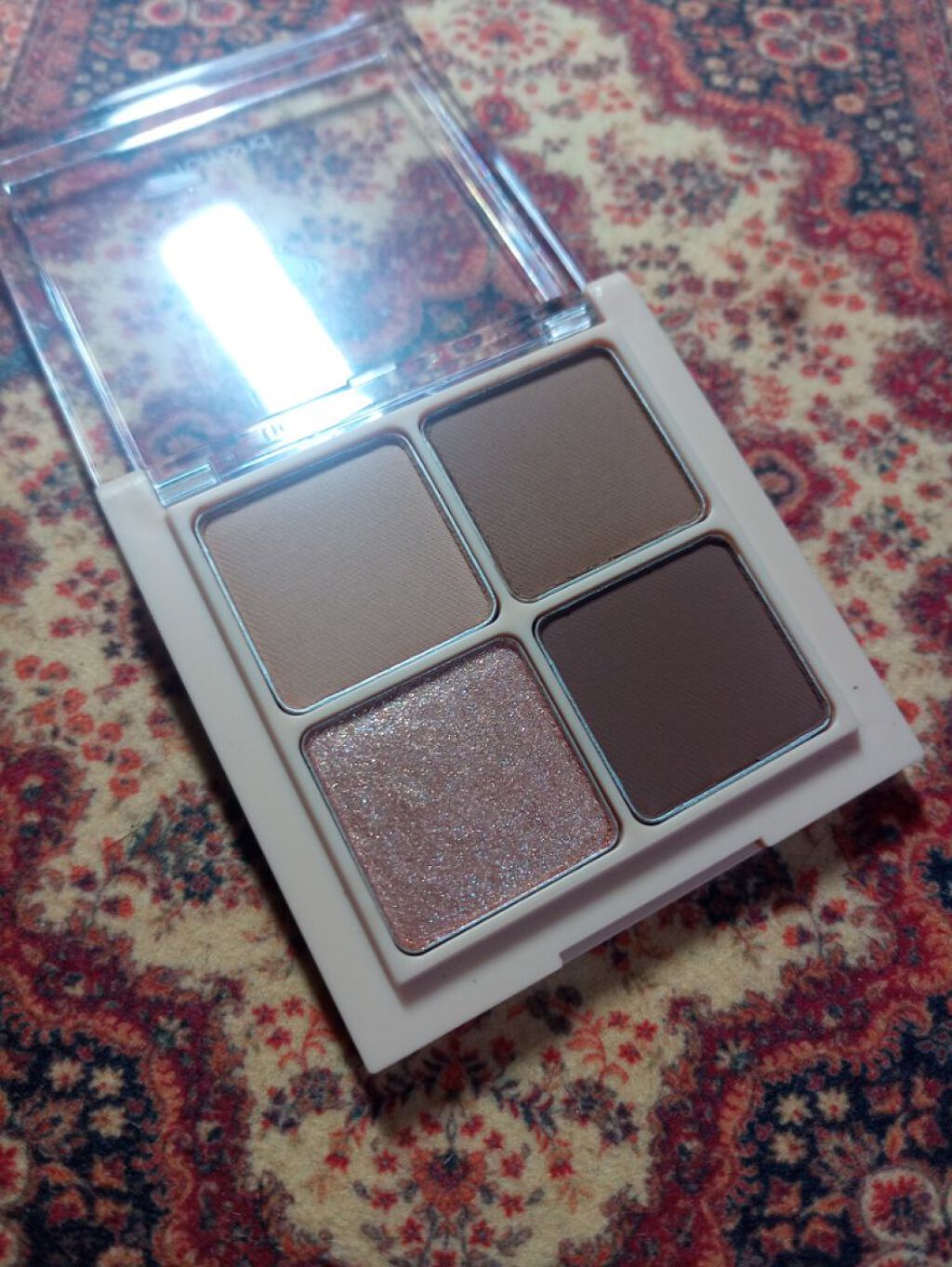左上のラメは、ゴールドにちょっとピンクがかった?色で派手さこそ無いものの、しっとりとした粉質で瞼に優しく光をくれます。 右上の明るいブラウンは、中間色として使えそうです。ココアのような色でもあるのですが、イエベでも使えます。 左下の濃いブラウンは、締め色として使えます。アイライナー代わりに入れても良さそう。 右下のオレンジは、パッと華やぐ色です。透け感のあるオレンジなので、オレンジメイクが苦手!という方でも使いやすいカラーです。 全体的に温かみのあるカラーで、秋らしいカラーかなと思います。また、透け感が強いので、いかにもマット!というアイシャドウが苦手な方でも使いやすいパレットかと。