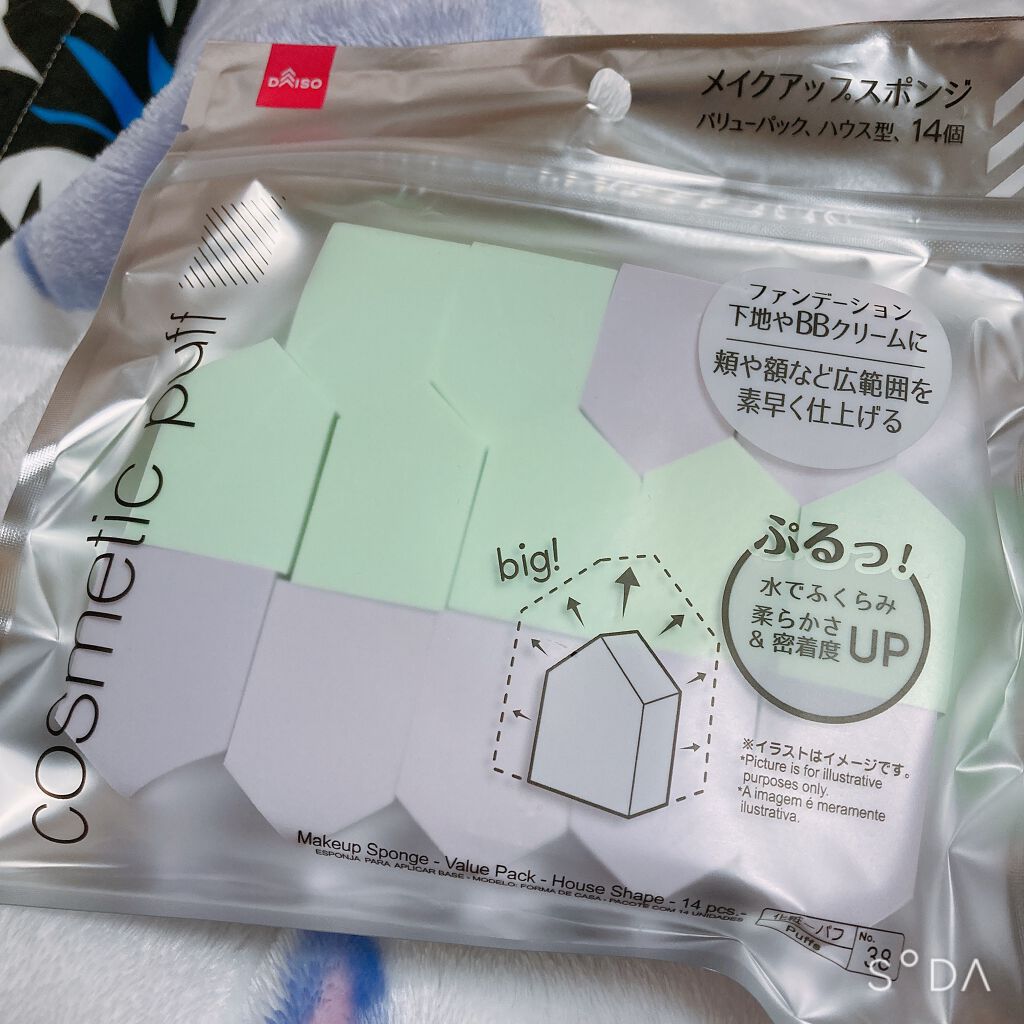 DAISOメイクアップスポンジバリューパックハウス型14個ダイヤモンド型15個それぞれ¥110ベースメイクは指で塗ることが多かったんだけど、これを使うと圧倒的に早く綺麗に仕上がるからついつい買っちゃう✨ちなみに私は水を含ませてプルプルにして使...