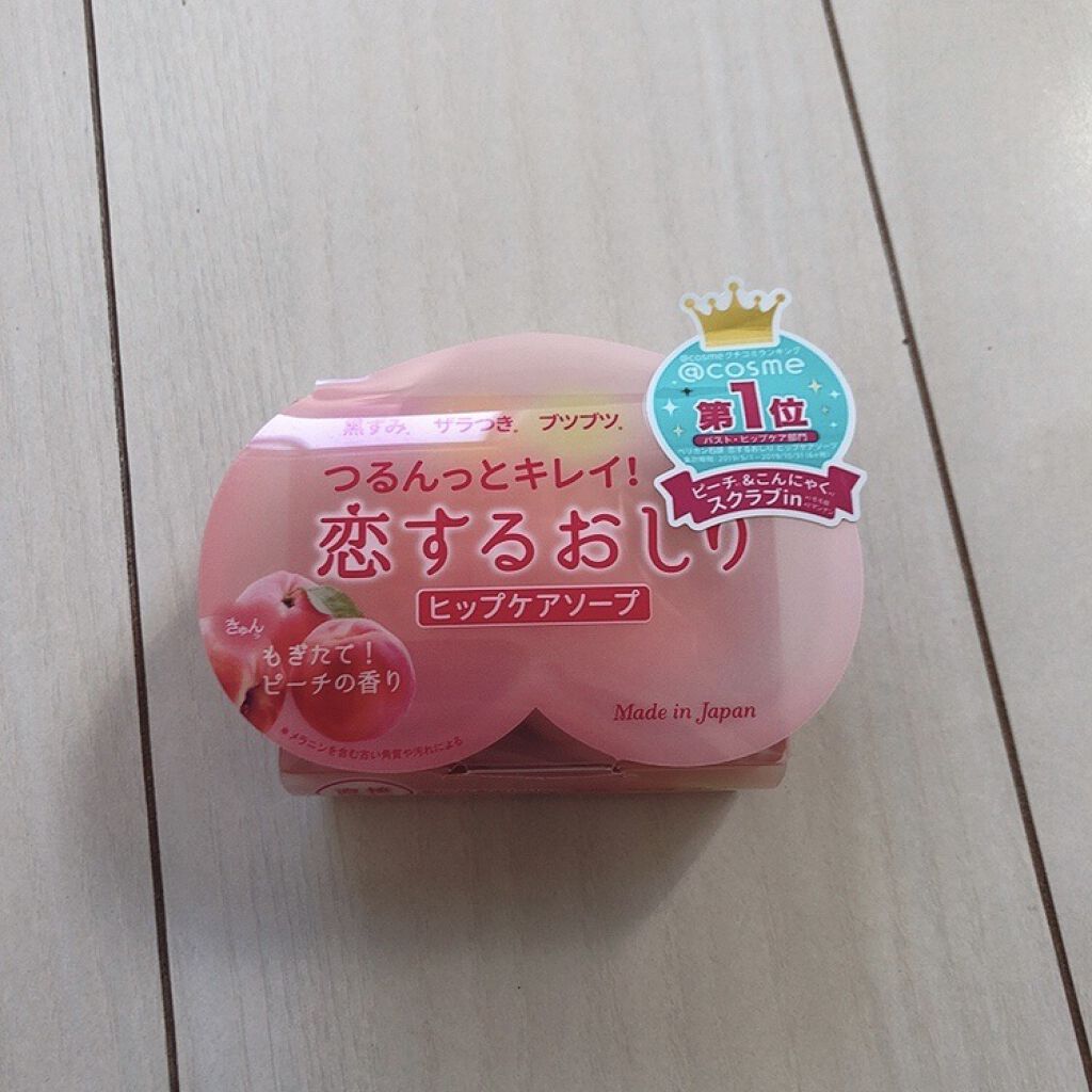 - 恋するおしり ヒップケアソープ おしりの黒ずみ・ザラつき・ブツブツにくるくる直接洗いの簡単ケア! (1)余分な古い角質を落とす:角質ケア スクラブ※1&ピーリング成分※2配合 【モモ核、マンナン※1 グルコノバクター/ハチミツ発酵液、 リンゴ酸・乳酸・クエン酸※2】 (2)必要なうるおいを守る:保湿ケア 6種※3の美容保湿エッセンスを配合 【モモ葉エキス、モモ種子エキス、ビワ葉エキス、キウイエキス、 アーチチョーク葉エキス、アロエベラ液汁※3】 ◎「きゅんっ」とする もぎたて!ピーチの香り