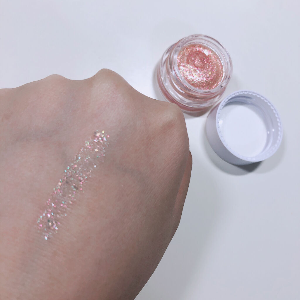 大きめのラメは、密着度が高くてギラッ!と存在感強め!でも目に入ると痛いので、涙袋やアイラインに重ねたり黒目から少し離したところに使うと良いと思います🙆♀️ 小さめのラメは、触り心地はむにゅっとしてて、少しクリームチークっぽいです!ほんとに綺麗な濡れツヤ瞼に仕上がります!