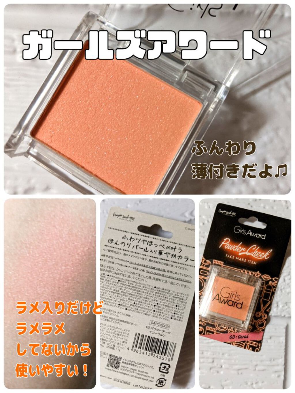 GAパウダーチークキャンドゥとガールズアワードのコラボコスメです。ライトピンク、オレンジ、コーラル、ピンクの4色です。粉の粒子が細かく、ライトピンクとコーラルはふんわりとつきます。しかし、オレンジとピンクはかなり発色するので要注意です。...