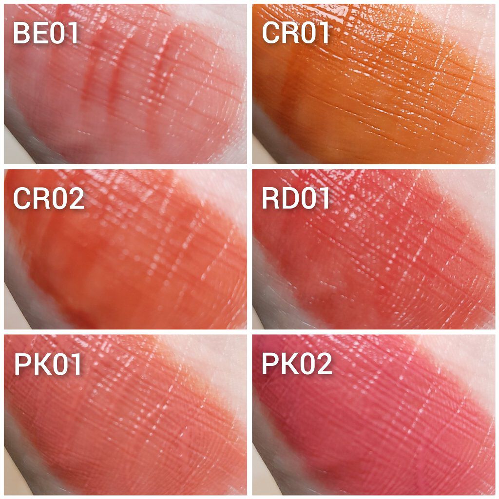 - <BE01 ピーチ> 水、BG、オクチルドデカノール、グリセリン、リンゴ酸ジイソステアリル、ビスジグリセリルポリアシルアジペート-2、水添ポリイソブテン、セテアリルアルコール、ダイマージリノール酸(フィトステリル/イソステアリル/セチル/ステアリル/ベヘニル)、ポリソルベート60、セスキオレイン酸ソルビタン、(アクリル酸ヒドロキシエチル/アクリロイルジメチルタウリンNa)コポリマー、エチルセルロース、トリイソステアリン酸ポリグリセリル-2、スクワラン、酸化チタン、ステアリン酸PEG-100、ステアリン酸グリセリル、1,2-ヘキサンジオール、ジメチコン、エチルヘキシルグリセリン、酸化鉄、イソステアリン酸ソルビタン、ヒアルロン酸Na、加水分解コラーゲン、ヒポファエラムノイデス水、スモモ果実エキス、ライチー果実エキス、カキ果実エキス、レモン果実エキス、モモ果実エキス、フラガリアチロエンシス果実エキス、デヒドロ酢酸、フェノキシエタノール、赤227、黄5、黄4、赤102、青1、香料 <CR01 甘柿> 水、BG、オクチルドデカノール、グリセリン、リンゴ酸ジイソステアリル、ビスジグリセリルポリアシルアジペート-2、水添ポリイソブテン、セテアリルアルコール、ダイマージリノール酸(フィトステリル/イソステアリル/セチル/ステアリル/ベヘニル)、トリイソステアリン酸ポリグリセリル-2、ポリソルベート60、セスキオレイン酸ソルビタン、(アクリル酸ヒドロキシエチル/アクリロイルジメチルタウリンNa)コポリマー、エチルセルロース、スクワラン、酸化チタン、ステアリン酸PEG-100、酸化鉄、ステアリン酸グリセリル、1,2-ヘキサンジオール、ジメチコン、エチルヘキシルグリセリン、イソステアリン酸ソルビタン、ヒアルロン酸Na、加水分解コラーゲン、ヒポファエラムノイデス水、スモモ果実エキス、ライチー果実エキス、カキ果実エキス、レモン果実エキス、モモ果実エキス、フラガリアチロエンシス果実エキス、デヒドロ酢酸、フェノキシエタノール、黄5、黄4、赤2、赤201、青1、香料 <CR02 ライチ> 水、BG、オクチルドデカノール、グリセリン、リンゴ酸ジイソステアリル、ビスジグリセリルポリアシルアジペート-2、水添ポリイソブテン、セテアリルアルコール、ダイマージリノール酸(フィトステリル/イソステアリル/セチル/ステアリル/ベヘニル)、ポリソルベート60、セスキオレイン酸ソルビタン、(アクリル酸ヒドロキシエチル/アクリロイルジメチルタウリンNa)コポリマー、エチルセルロース、トリイソステアリン酸ポリグリセリル-2、スクワラン、ステアリン酸PEG-100、ステアリン酸グリセリル、1,2-ヘキサンジオール、ジメチコン、酸化チタン、エチルヘキシルグリセリン、酸化鉄、イソステアリン酸ソルビタン、ヒアルロン酸Na、加水分解コラーゲン、ヒポファエラムノイデス水、スモモ果実エキス、ライチー果実エキス、カキ果実エキス、レモン果実エキス、モモ果実エキス、フラガリアチロエンシス果実エキス、デヒドロ酢酸、フェノキシエタノール、黄5、赤202、赤2、橙205、青1、香料 <RD01 ストロベリー> 水、BG、オクチルドデカノール、グリセリン、リンゴ酸ジイソステアリル、ビスジグリセリルポリアシルアジペート-2、水添ポリイソブテン、セテアリルアルコール、ダイマージリノール酸(フィトステリル/イソステアリル/セチル/ステアリル/ベヘニル)、ポリソルベート60、セスキオレイン酸ソルビタン、(アクリル酸ヒドロキシエチル/アクリロイルジメチルタウリンNa)コポリマー、トリイソステアリン酸ポリグリセリル-2、エチルセルロース、スクワラン、ステアリン酸PEG-100、ステアリン酸グリセリル、1,2-ヘキサンジオール、酸化チタン、ジメチコン、エチルヘキシルグリセリン、イソステアリン酸ソルビタン、ヒアルロン酸Na、酸化鉄、加水分解コラーゲン、ヒポファエラムノイデス水、スモモ果実エキス、ライチー果実エキス、カキ果実エキス、レモン果実エキス、モモ果実エキス、フラガリアチロエンシス果実エキス、デヒドロ酢酸、フェノキシエタノール、赤202、赤102、赤2、黄4、赤227、青1、香料 <PK01 ピンクレモン> 水、BG、オクチルドデカノール、グリセリン、リンゴ酸ジイソステアリル、ビスジグリセリルポリアシルアジペート-2、水添ポリイソブテン、セテアリルアルコール、ダイマージリノール酸(フィトステリル/イソステアリル/セチル/ステアリル/ベヘニル)、ポリソルベート60、セスキオレイン酸ソルビタン、(アクリル酸ヒドロキシエチル/アクリロイルジメチルタウリンNa)コポリマー、トリイソステアリン酸ポリグリセリル-2、エチルセルロース、酸化チタン、スクワラン、ステアリン酸PEG-100、ステアリン酸グリセリル、1,2-ヘキサンジオール、ジメチコン、エチルヘキシルグリセリン、酸化鉄、イソステアリン酸ソルビタン、ヒアルロン酸Na、加水分解コラーゲン、ヒポファエラムノイデス水、スモモ果実エキス、ライチー果実エキス、カキ果実エキス、レモン果実エキス、モモ