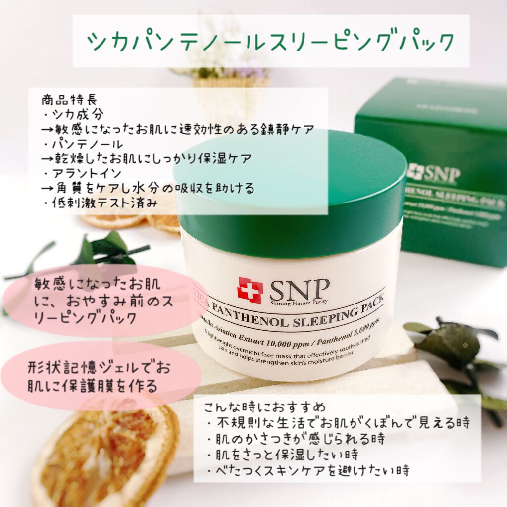 形状記憶ジェルで新感覚‼️寝ている間に鎮静💤【SNPシカパンテノールスリーピングパック】ふだん韓国コスメはあまり使用しない私ですが、敏感肌でも使えるとのことで、この度はご縁があって体験させていただきました☺️こちらのジェルは日中刺激を受けて敏...