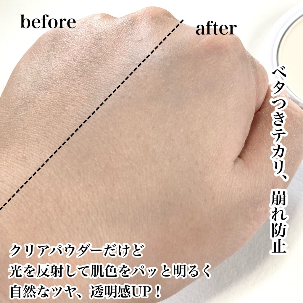 - ふんわり柔らかい質感、ツルンと美しい陶器肌を実現するプレストパウダー。 さらさらしっとりの絹のような微粒子特殊パウダーで、ひと塗りでワントーン明るくキメ細やかな陶器肌へと仕上げます。 配合された皮脂吸着パウダーが化粧崩れを防止し、肌を守るCICAスキンバリア成分※1とヒアルロン酸※2でしっとり長時間美しい肌をキープ。 クリアカラーなのでファンデーションの色を選ばずにお使いいただけます。 鼻筋・おでこ・頬など顔の部分的にハイライターとして使うことで自然な立体感やツヤ感も出してくれます。 ●レフ版効果で透明感をプラスして映りをワンランクアップ 微粒子の特殊パウダーが光を反射し顔色をパっとと明るく仕上げて、自然なツヤと透明感を演出 ●ソフトフォーカス効果でツルンとした陶器肌に フォトグラフィックパウダーを新配合し、毛穴をカバーして美肌フィルターをかけたようなキメ細かい立体感のある肌を演出 ●汗・水に強い「持続力・耐久力」 ウォータープルーフ効果で汗をかいても崩れにくく、時間がたってもくすまず美しい仕上がり ●サラサラの使用感でメイク崩れも防止 肌のベタつきやテカリを抑え、摩擦などによるメイク崩れを防止して長時間キープ ●注目の「CICAスキンバリア成分※1」配合 CICA成分※を新たに配合し、メイクしながらしっかりお肌を守るスキンケア効果をプラス ●お肌の潤いをキープ ヨモギ・ハトムギ種子エキス※2も配合し、お肌に潤いも与えてしっとり優しい処方 ●UV効果 ●ハイライターとしても使用可能 ※1ツボクサエキス(保湿成分) ※2保湿成分