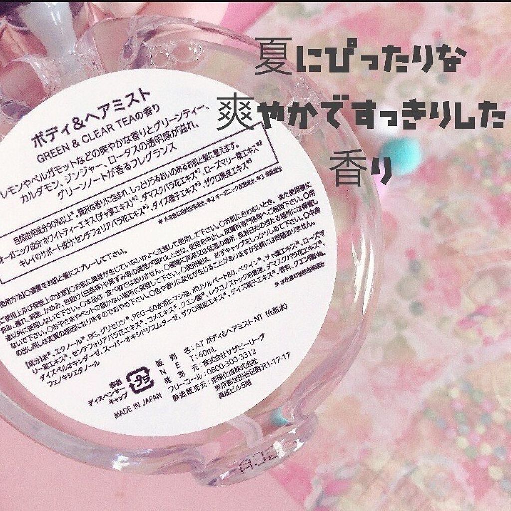 - ナチュラルティーケアシリーズのボディ&ヘアミストです。贅沢な香りに包まれ、しっとりうるおいのあるお肌と髪に整えます。自然由来成分90%以上。 【グリーン】GREEN&CLEAR TEAの香り:レモンやベルガモットなどの爽やかな香りとグリーンティー、カルダモン、ジンジャー、ロータスの透明感溢れるグリーンノートの香り